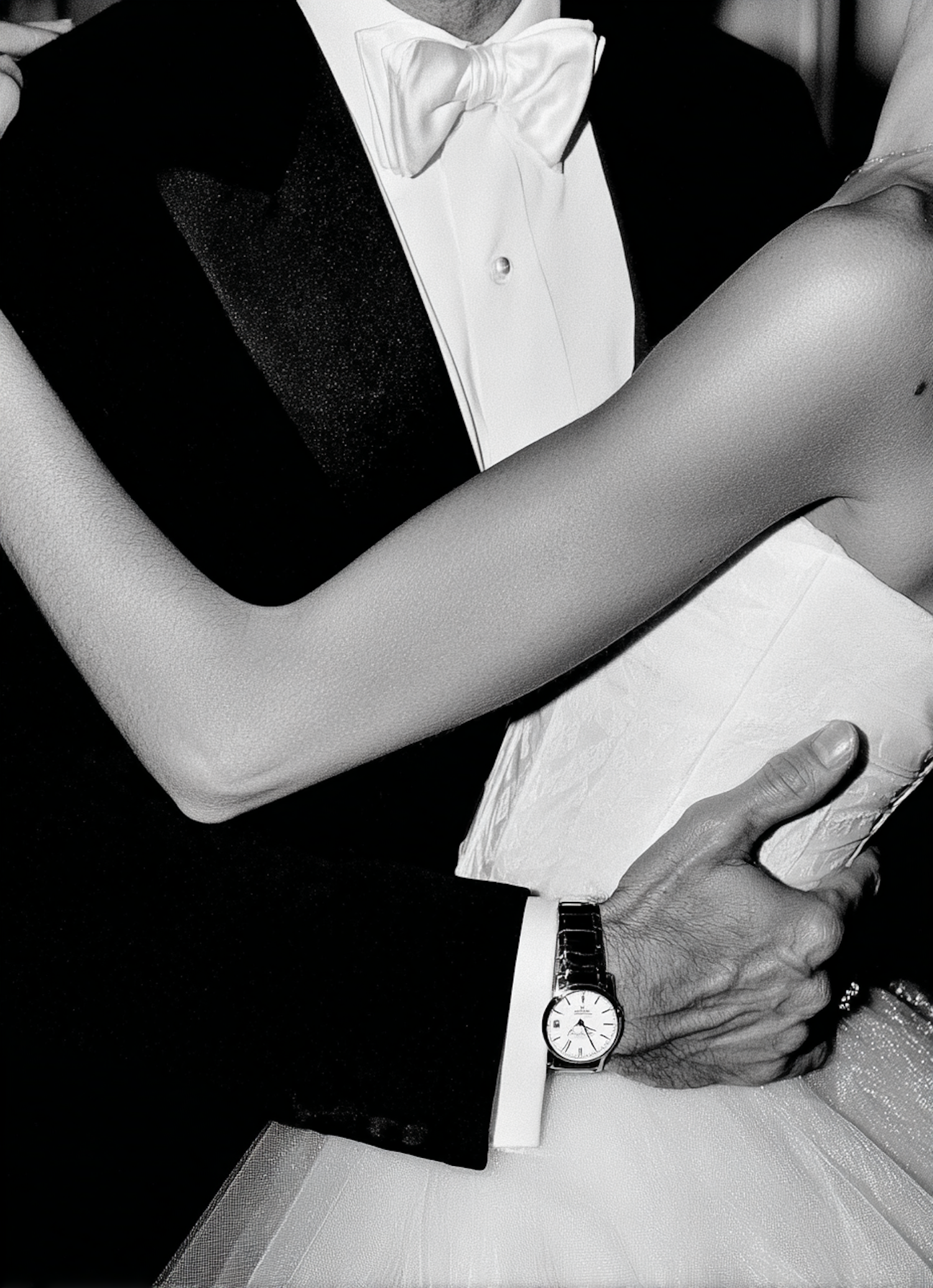 A close-up black-and-white photo of a couple in formal attire, highlighting their elegant clothing and a stylish wristwatch.