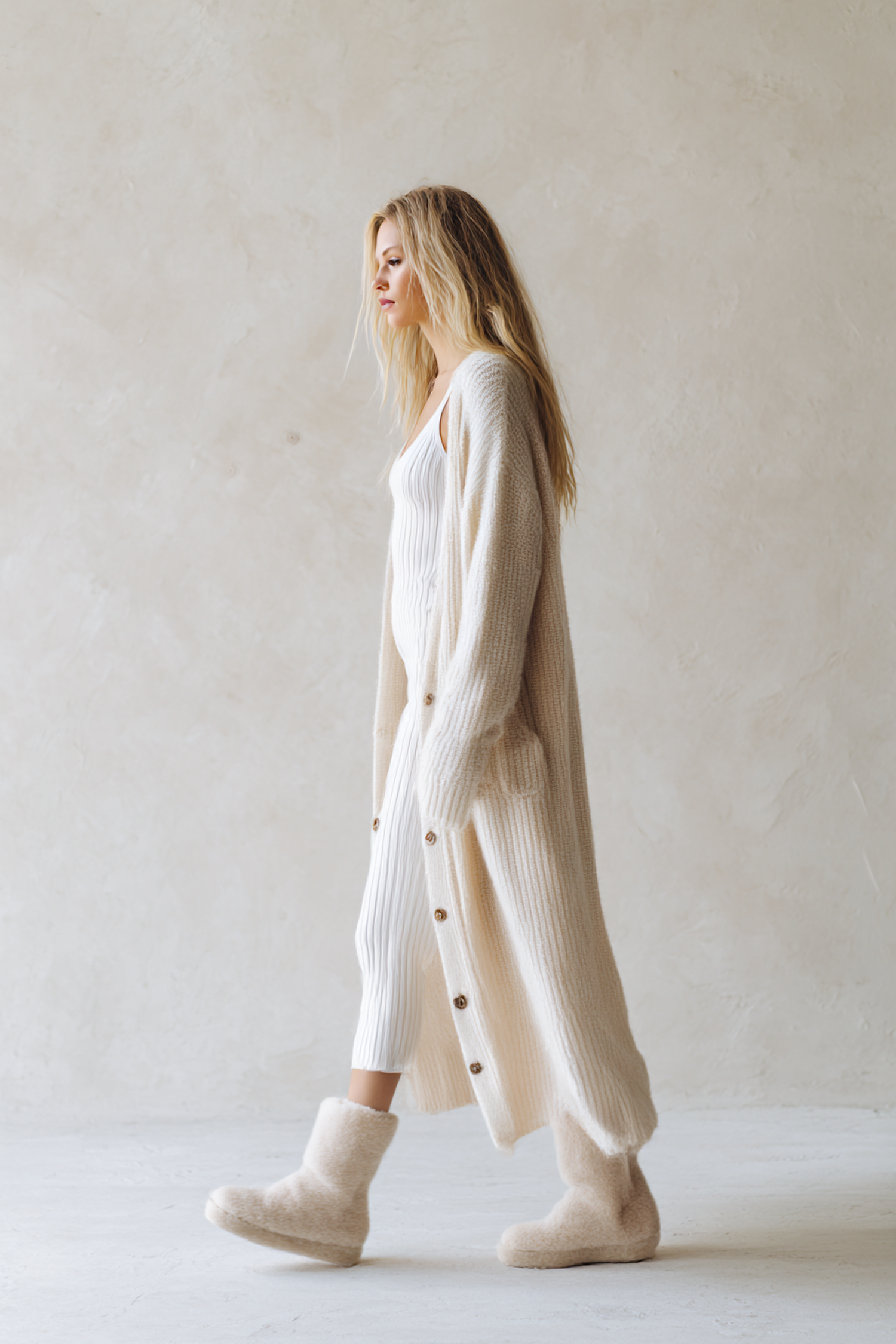 A stylish individual models a cream cardigan, white dress, and cozy beige boots in a serene indoor setting.
