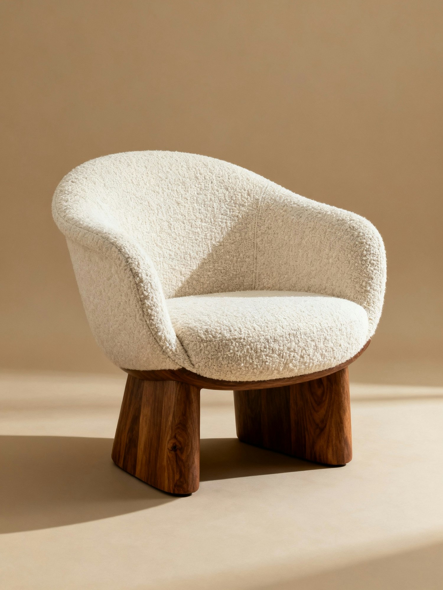 Professional interior design photography, warm and textured atmosphere, soft natural lighting, retro-modern aesthetic, mid-century inspired furniture, crafted wooden details, neutral tones with accents of earthy colors, editorial style, timeless and sophisticated mood. A retro-modern armchair with organic curves, walnut wooden legs, and off-white boucle fabric upholstery. The chair has a rounded backrest, wide seat, and sculptural wooden base, designed in a timeless mid-century style. Studio photo on a plain beige background, captured from the front, centered composition, soft shadows to emphasize proportions.