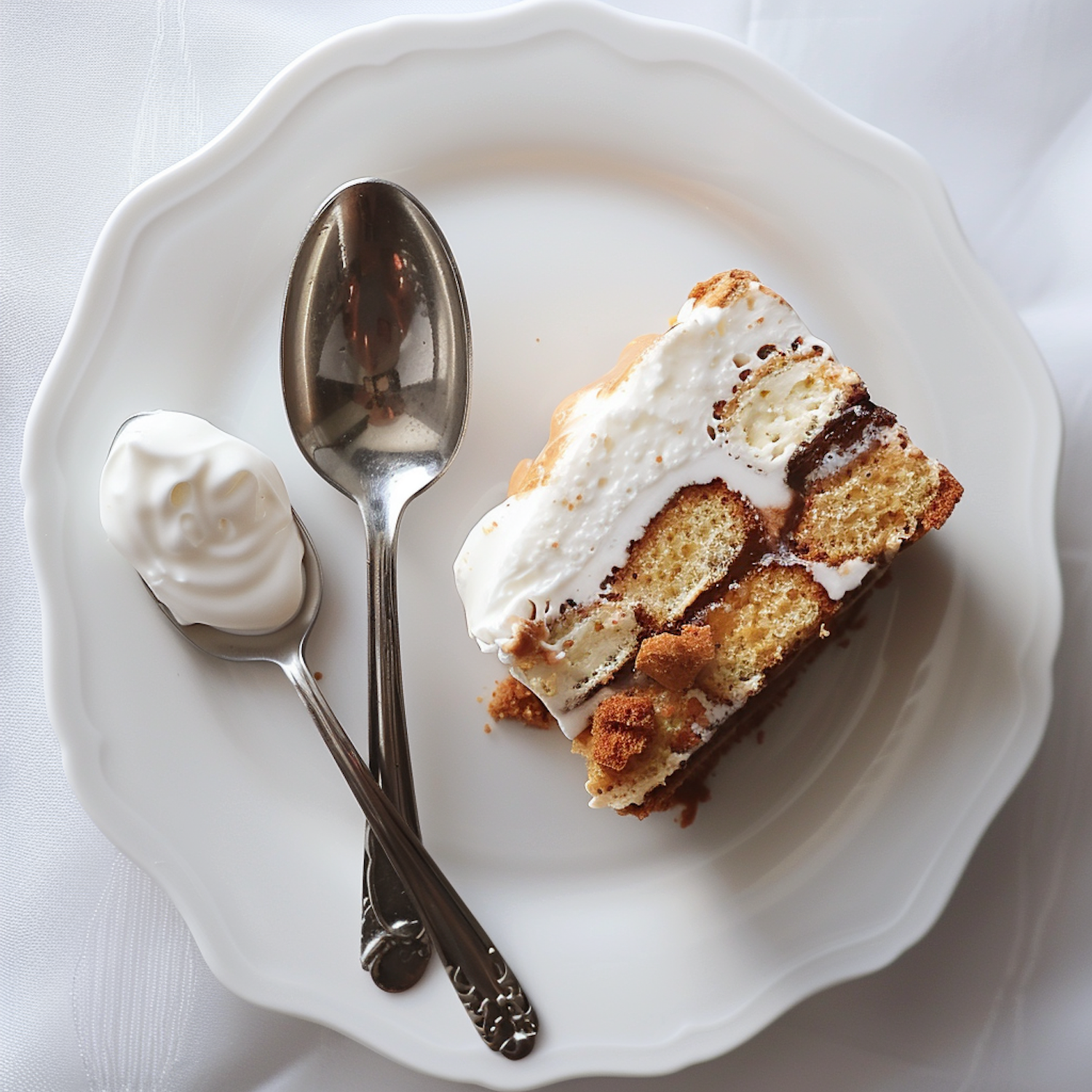 Elegant dessert slice with cream layers on a white plate, accompanied by two ornate silver spoons and a dollop of whipped cream.