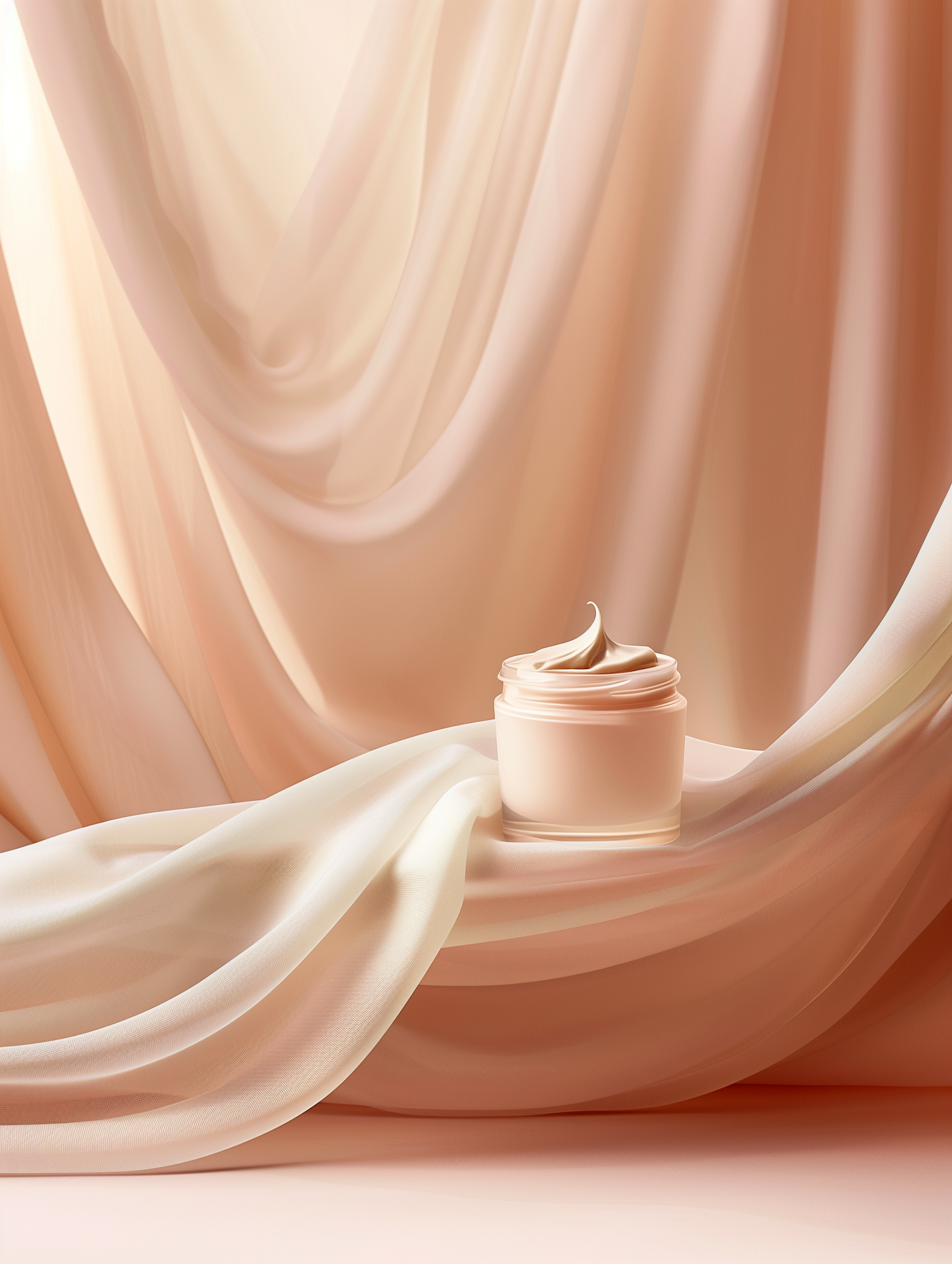 Elegant cream jar displayed on soft pastel fabric, emphasizing luxury and skincare focus, ideal for promotional settings.