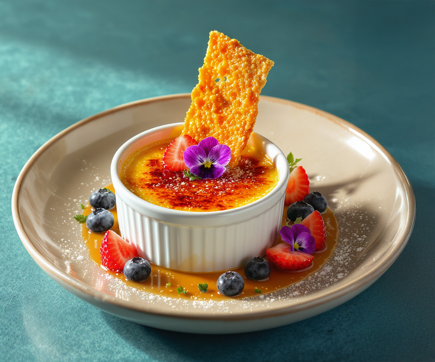 Elegant crème brûlée with caramelized top, fresh berries, edible flower, and a crisp tuile, served on a beige plate with a vibrant background.