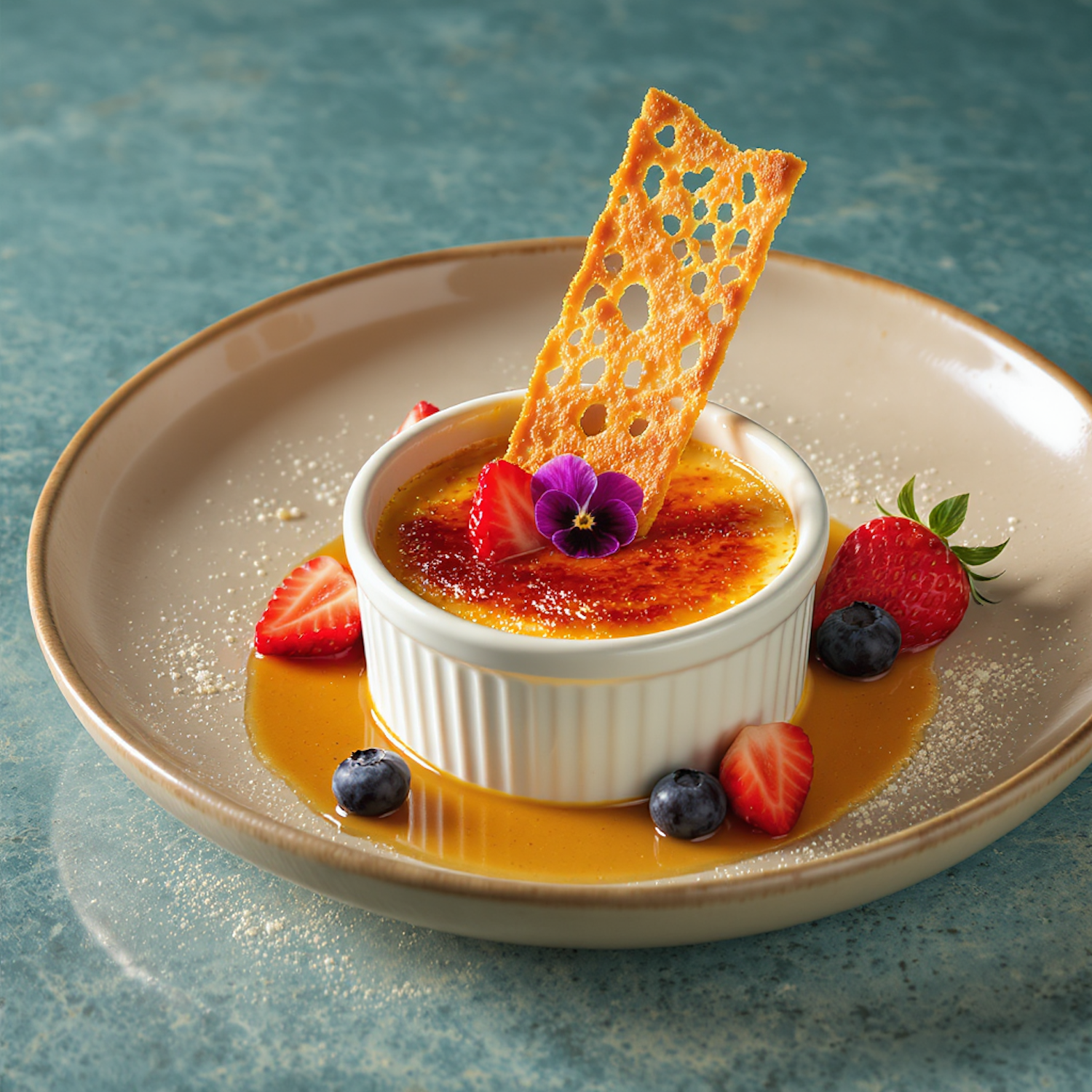 Elegant crème brûlée with caramelized top, fresh berries, and a crispy tuile, served on a beige plate with a blue background.
