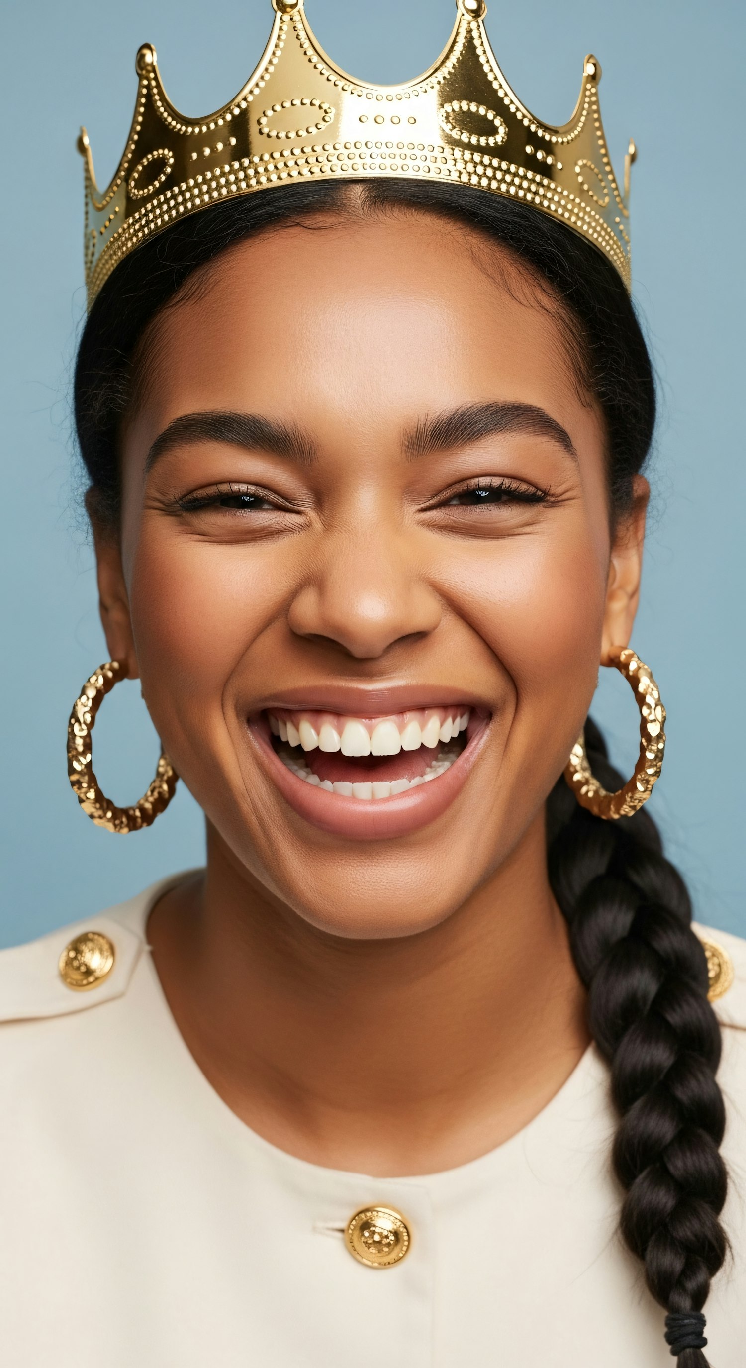 Bright portrait of a smiling woman wearing a gold crown and textured hoop earrings against a light blue background.