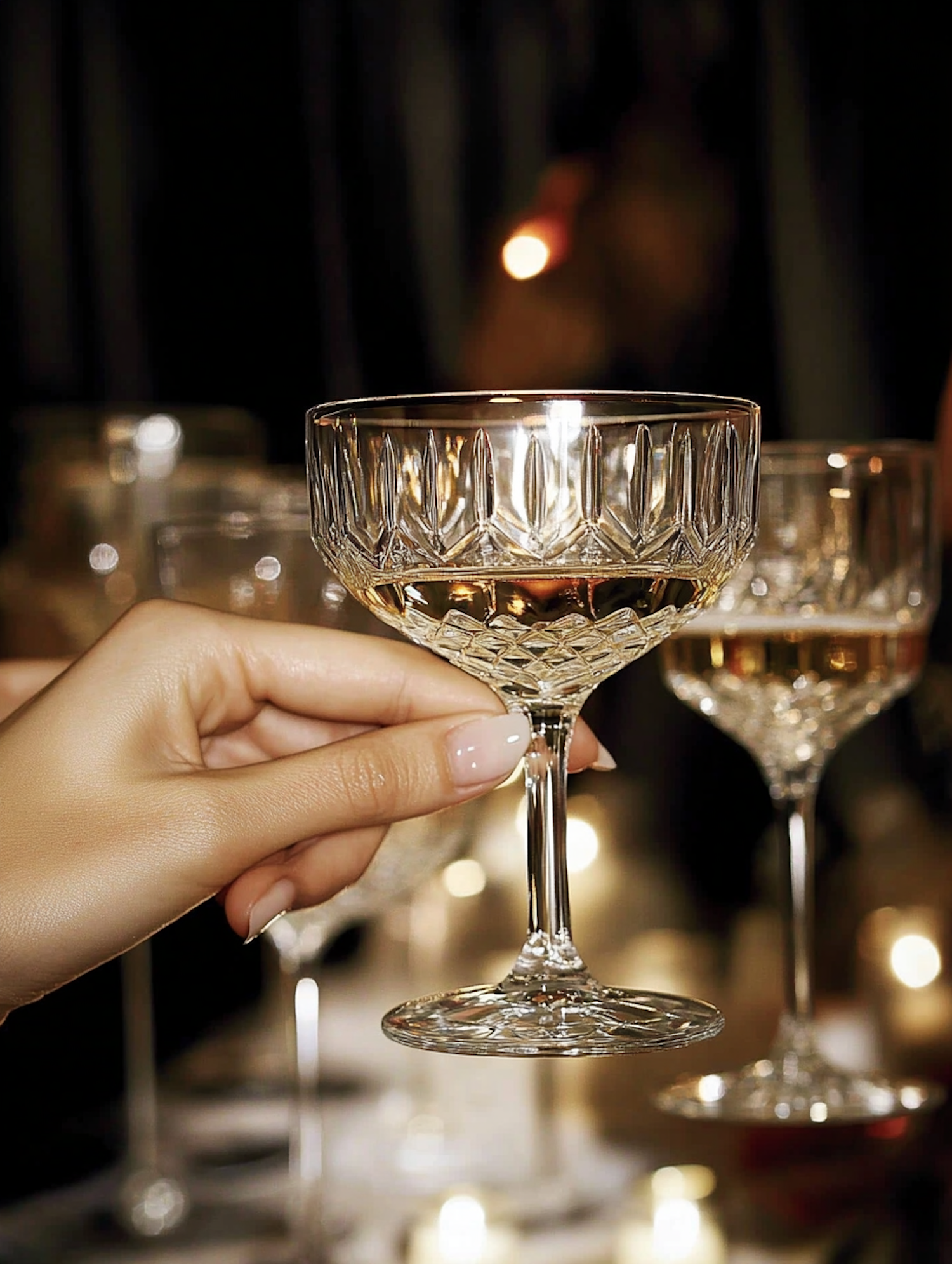 Close-up of a hand holding a crystal coupe glass with champagne, surrounded by warm lights and a festive atmosphere.