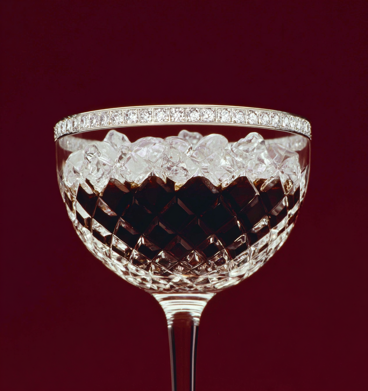 A luxurious crystal glass with diamond accents, filled with ice and a dark liquid, set against a rich red background.