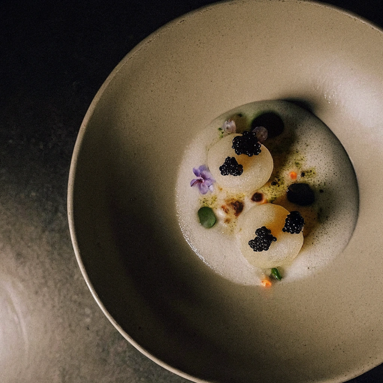 Elegant dish with translucent spheres, black caviar, foam, and edible flowers in a minimalist beige bowl. Perfect for fine dining lovers.