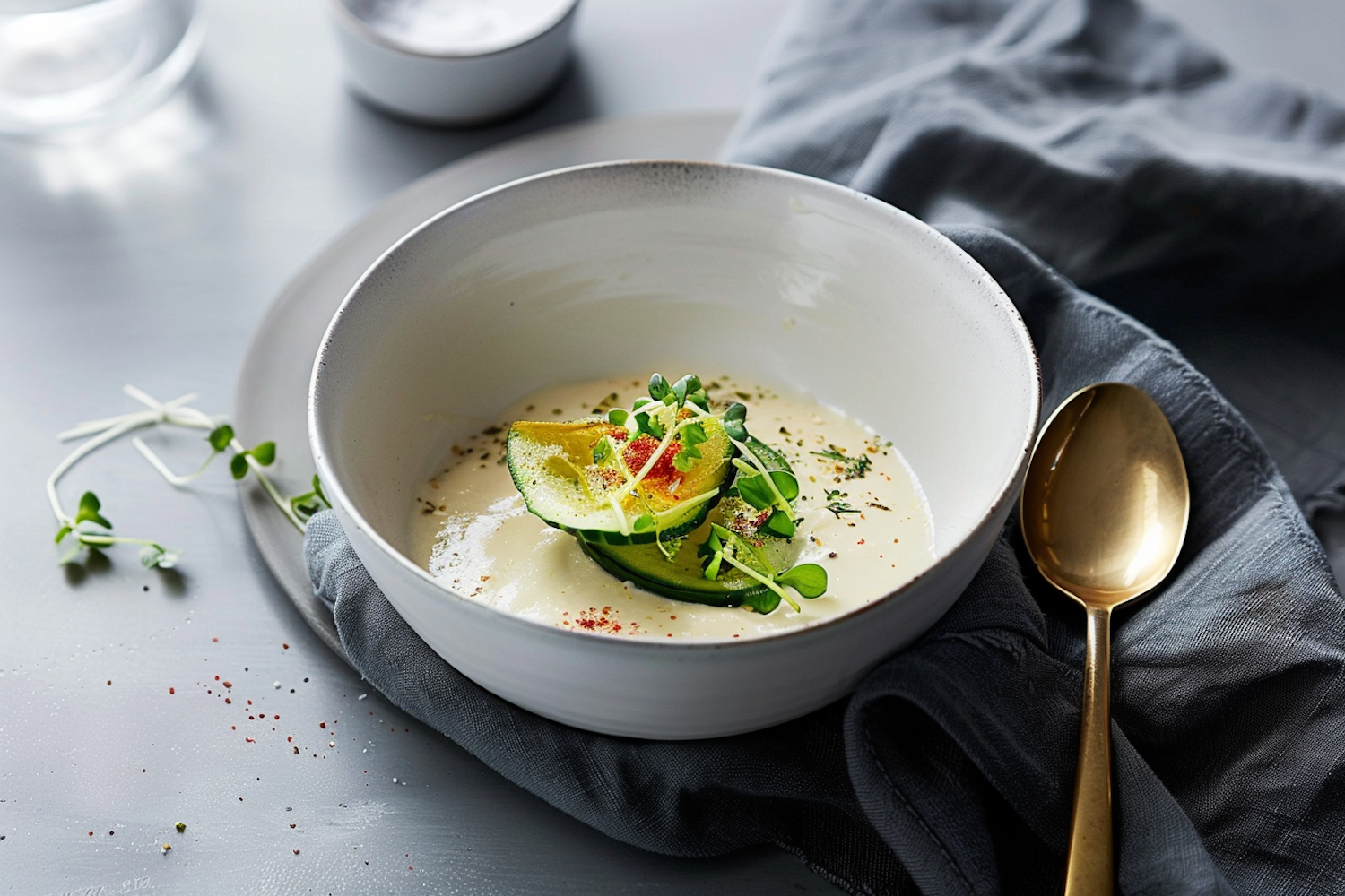 Elegant bowl of creamy soup with zucchini and microgreens, garnished with pepper. Gold spoon adds a touch of luxury.