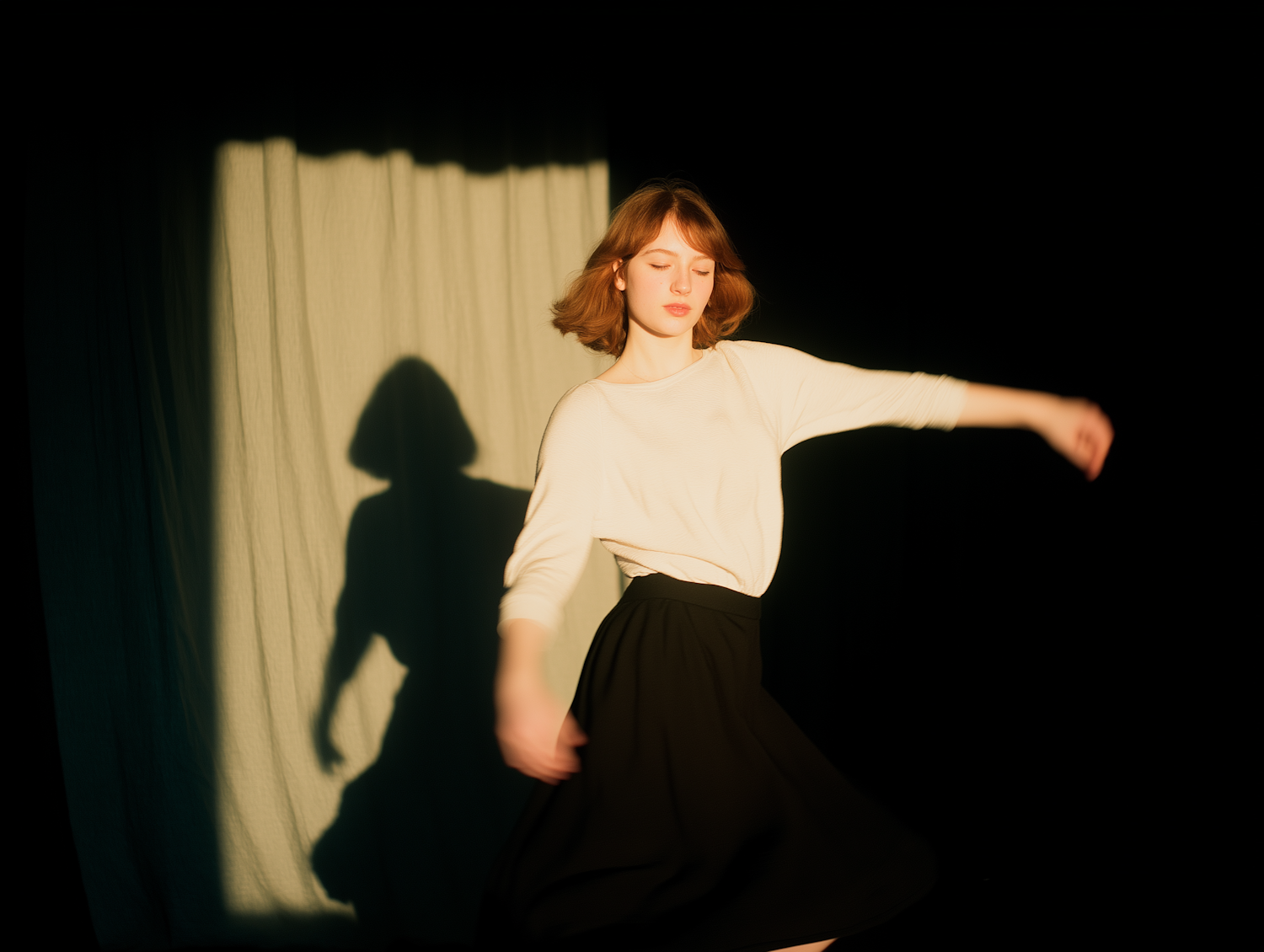 A person performing a graceful posing dance in soft dramatic lighting, wearing a cream sweater and black skirt, set against a shadowed fabric backdrop.