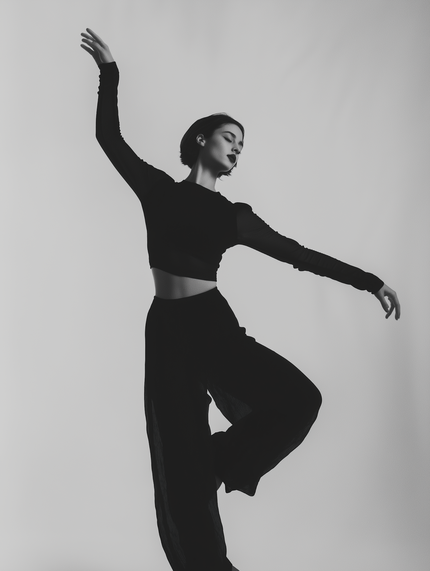 Elegant black and white photo of a dancer in motion in a posing dance, wearing flowing attire and caught mid-movement, exuding grace and precision.