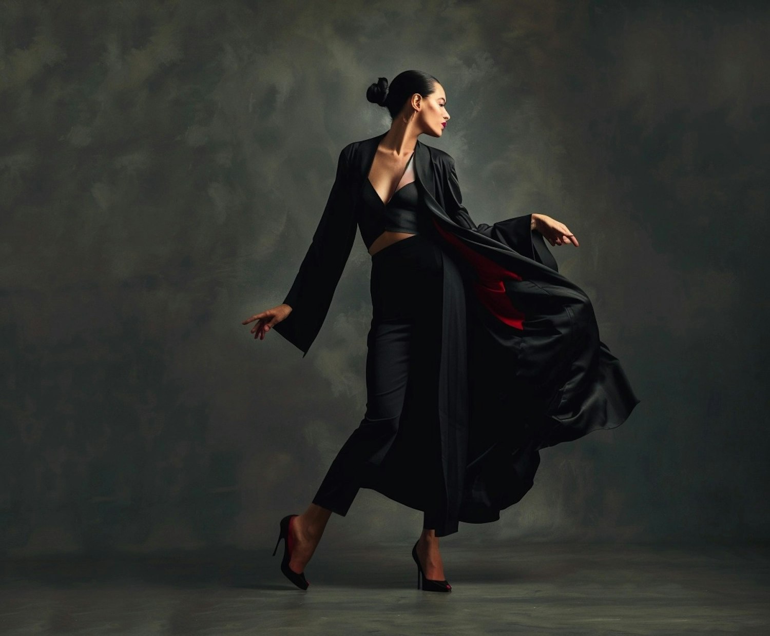 Elegant woman in black outfit with red-lined coat poses gracefully against a dark background, exuding style and poise.