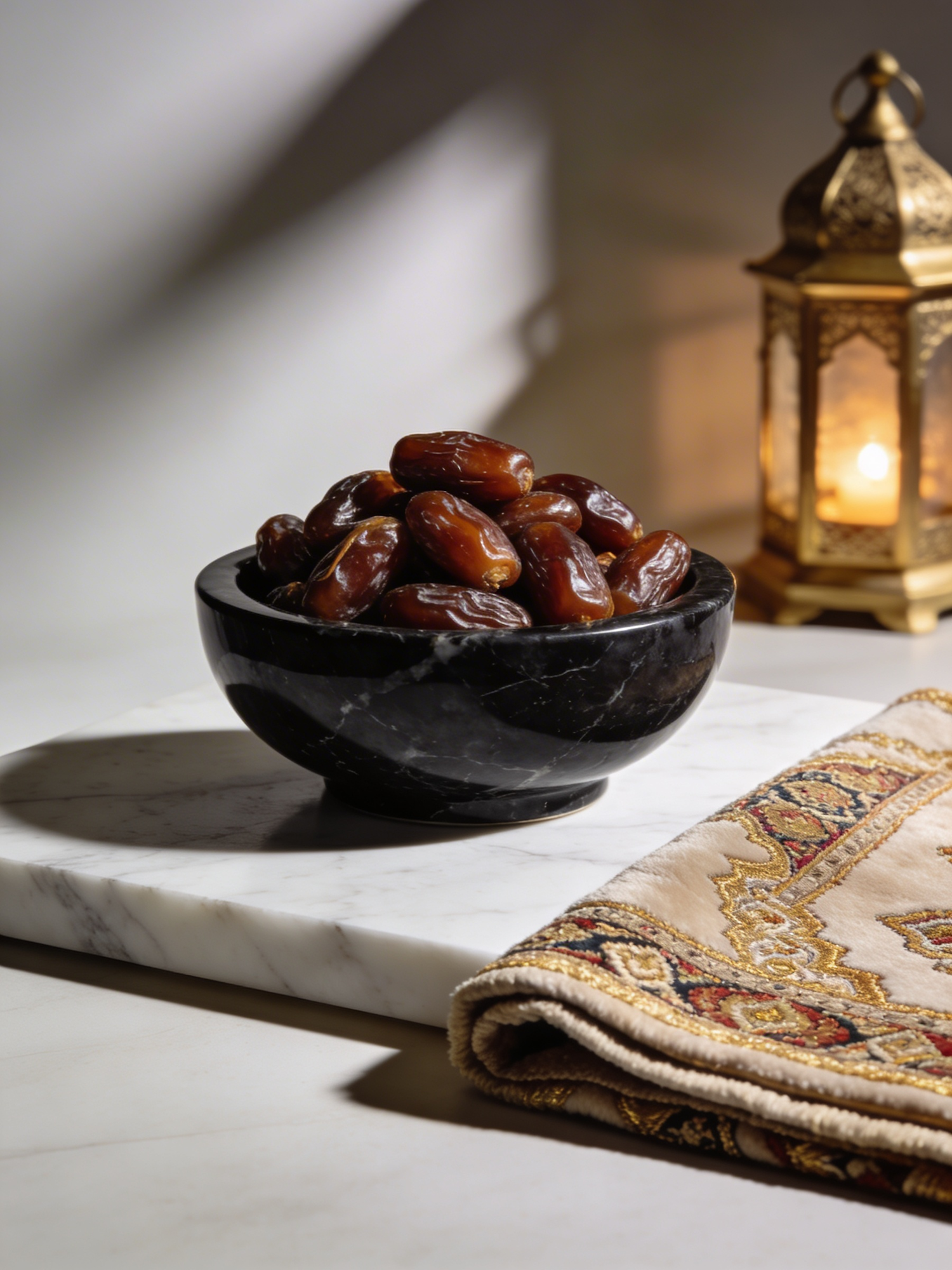 A black marble bowl of dates on a white slab, with a golden lantern and patterned fabric, creating a warm and elegant setting.