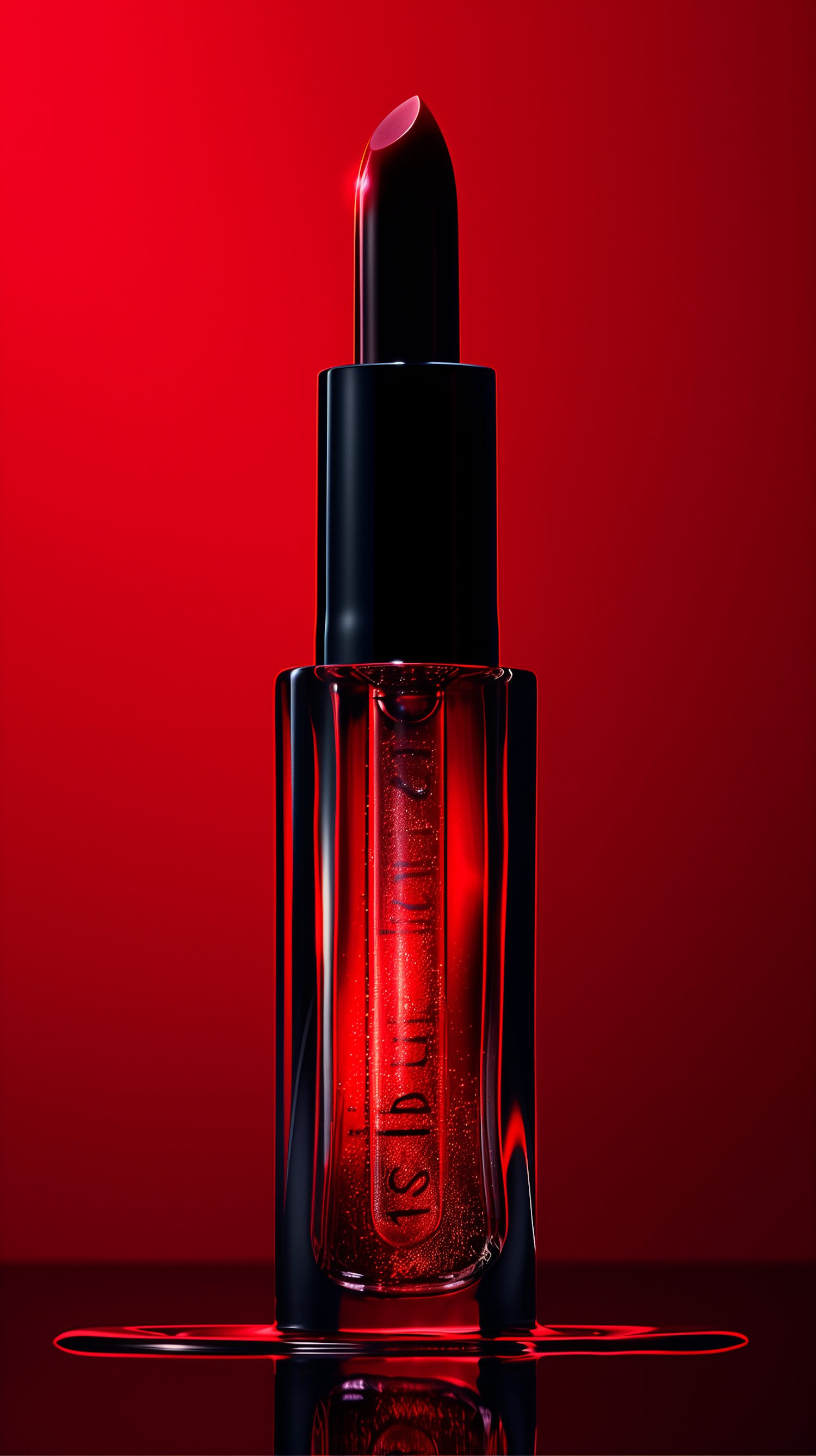 Elegant red lipstick with glossy finish against a vibrant red background, exuding luxury and sophistication.
