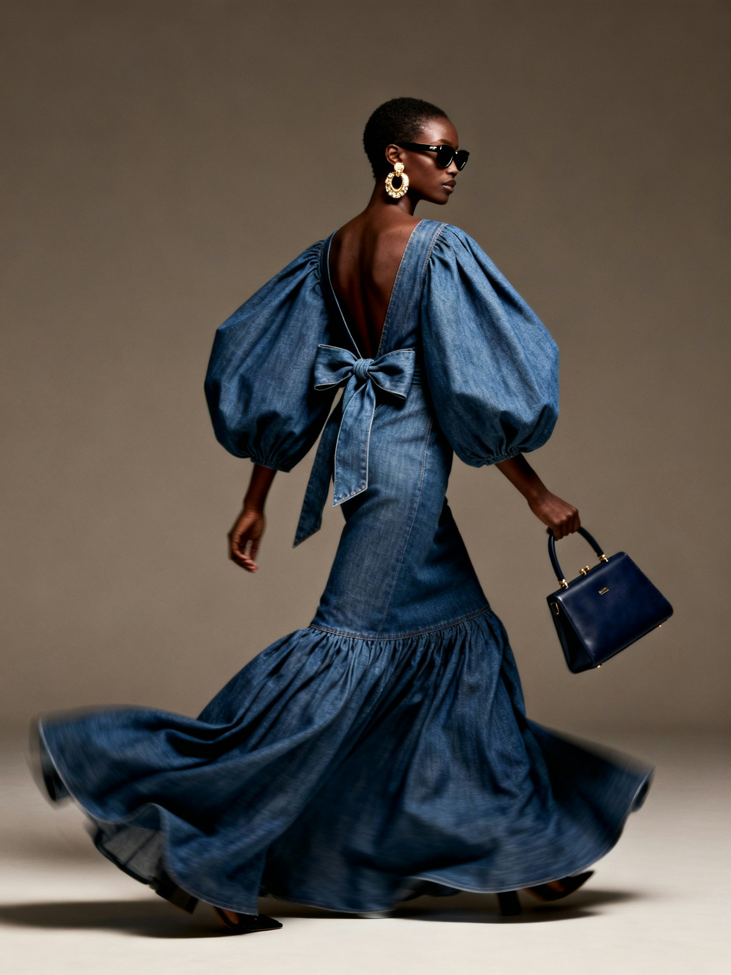 High-definition, cinematic full-body portrait of a stylish Black woman walking confidently against a smooth, muted neutral background. She wears a dramatic denim dress with voluminous sleeves, a deep back cut, and a large bow tied at the waist, while the gathered skirt flows dynamically with each step. Accessories include oversized sunglasses, statement earrings, and a structured dark-blue handbag. Subtle motion blur emphasizes the flowing skirt and sleeves, adding editorial energy. Soft, warm directional lighting highlights the textures of the denim, the gleam of her accessories, and her flawless, glowing skin. Slightly shallow depth of field keeps the focus on her confident stride and fashion-forward presence. Mood: bold, elegant, and cinematic—high-fashion denim elevated with dynamic editorial flair.