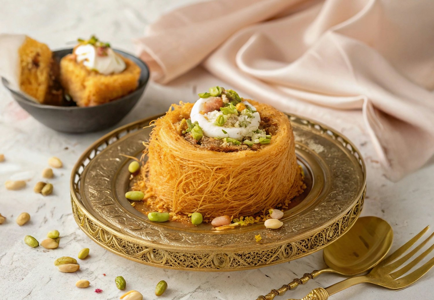 Golden crispy pastry nest dessert with creamy topping and pistachios, served on an ornate plate with elegant golden cutlery.