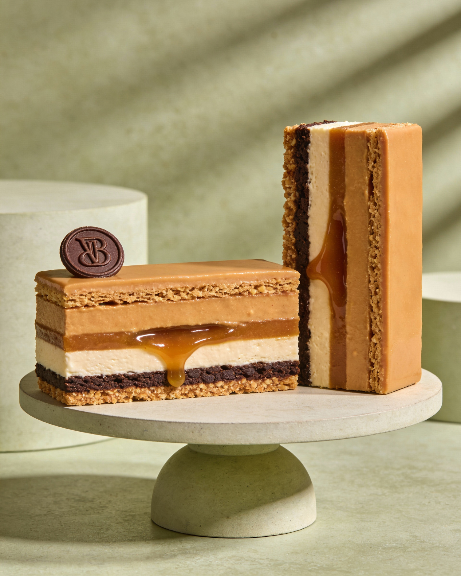 editorial luxury pastry photography, high-end studio food photography, soft directional light from one side, subtle long shadows, calm and refined atmosphere, pale khaki green background, cylindrical pedestals and round platforms in matte mineral texture and the same khaki green color of the background, soft matte surfaces mixed with glossy accents, sculptural composition, minimalist but rich in volume, premium color grading, shallow depth of field, ultra realistic textures, macro-level detail, no text, rectangular pastry cut in half revealing multiple clean layers: crunchy base, dark chocolate biscuit, silky caramel layer, light mousse, glossy insert, one half standing upright, the other lying flat, slight drip of caramel flowing from the center, small chocolate medallion on top reserved for monogram, placed on a round pedestal, close-up focus on textures and layers