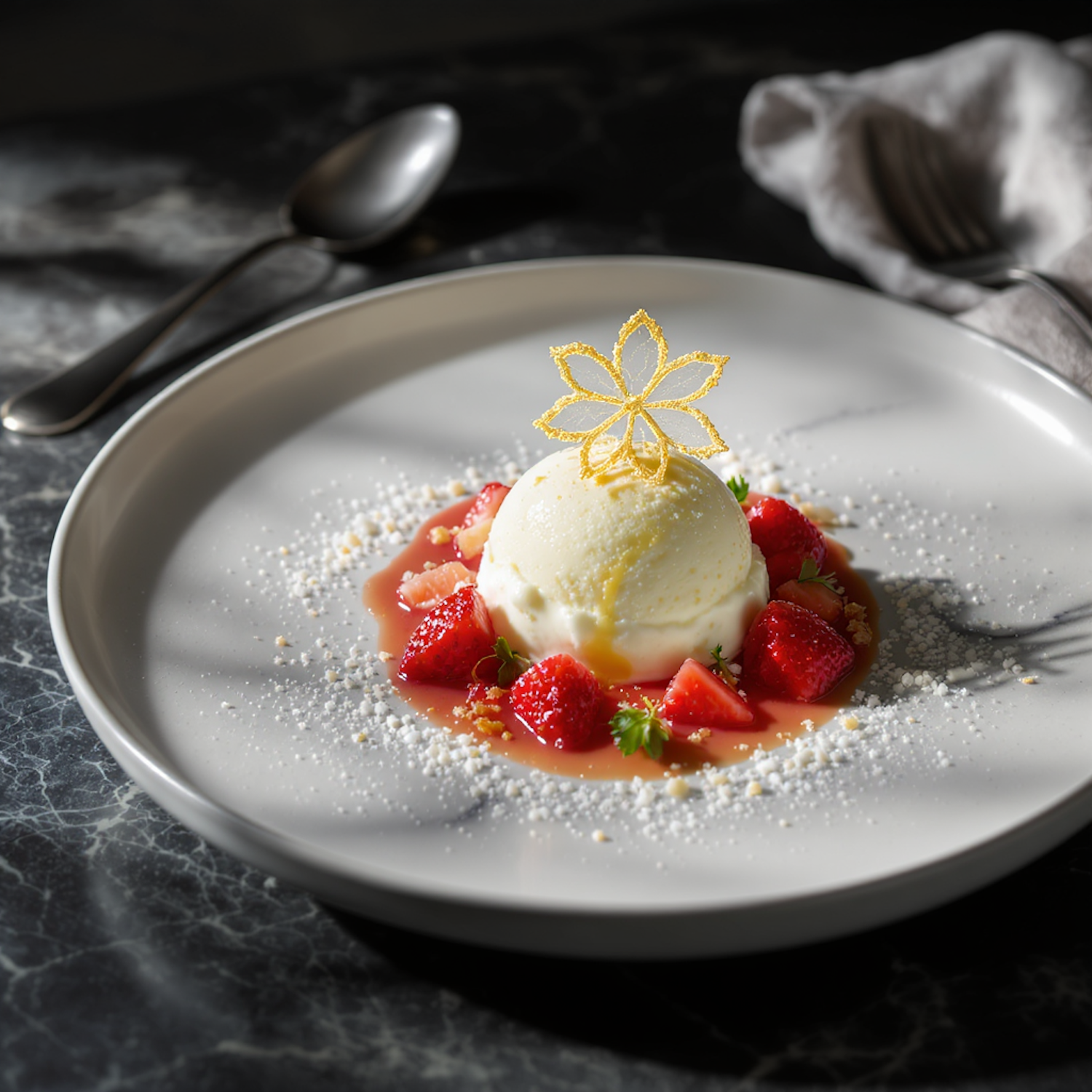 Elegant dessert with vanilla ice cream, fresh strawberries, and a sugar flower garnish, served on a white plate with artistic presentation.