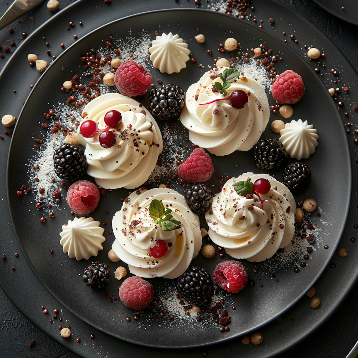 Elegant dessert plate with creamy frosting swirls, fresh berries, and meringue kisses on a dark plate, creating a visually stunning treat.