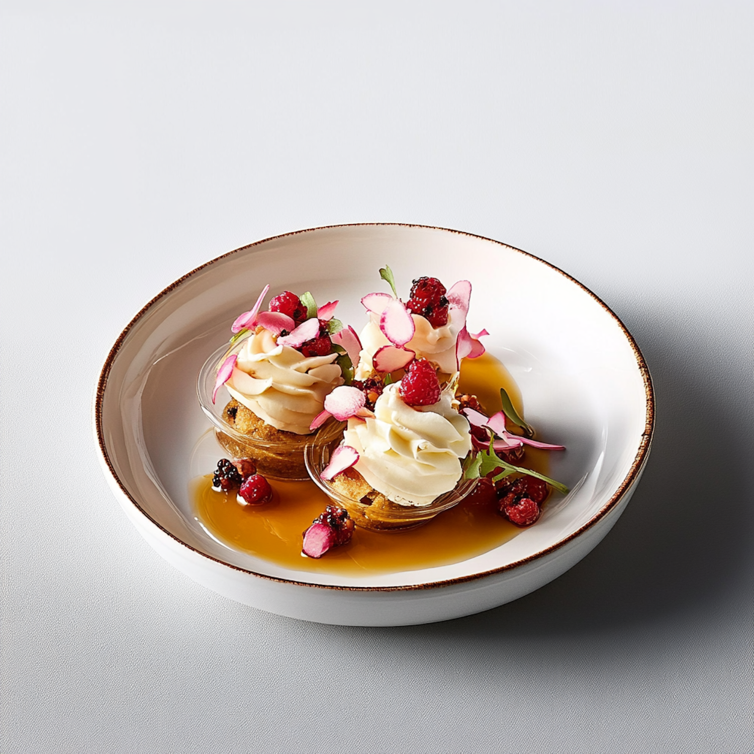 Elegant dessert with creamy frosting, fresh raspberries, and pink petals in a white bowl with golden syrup.