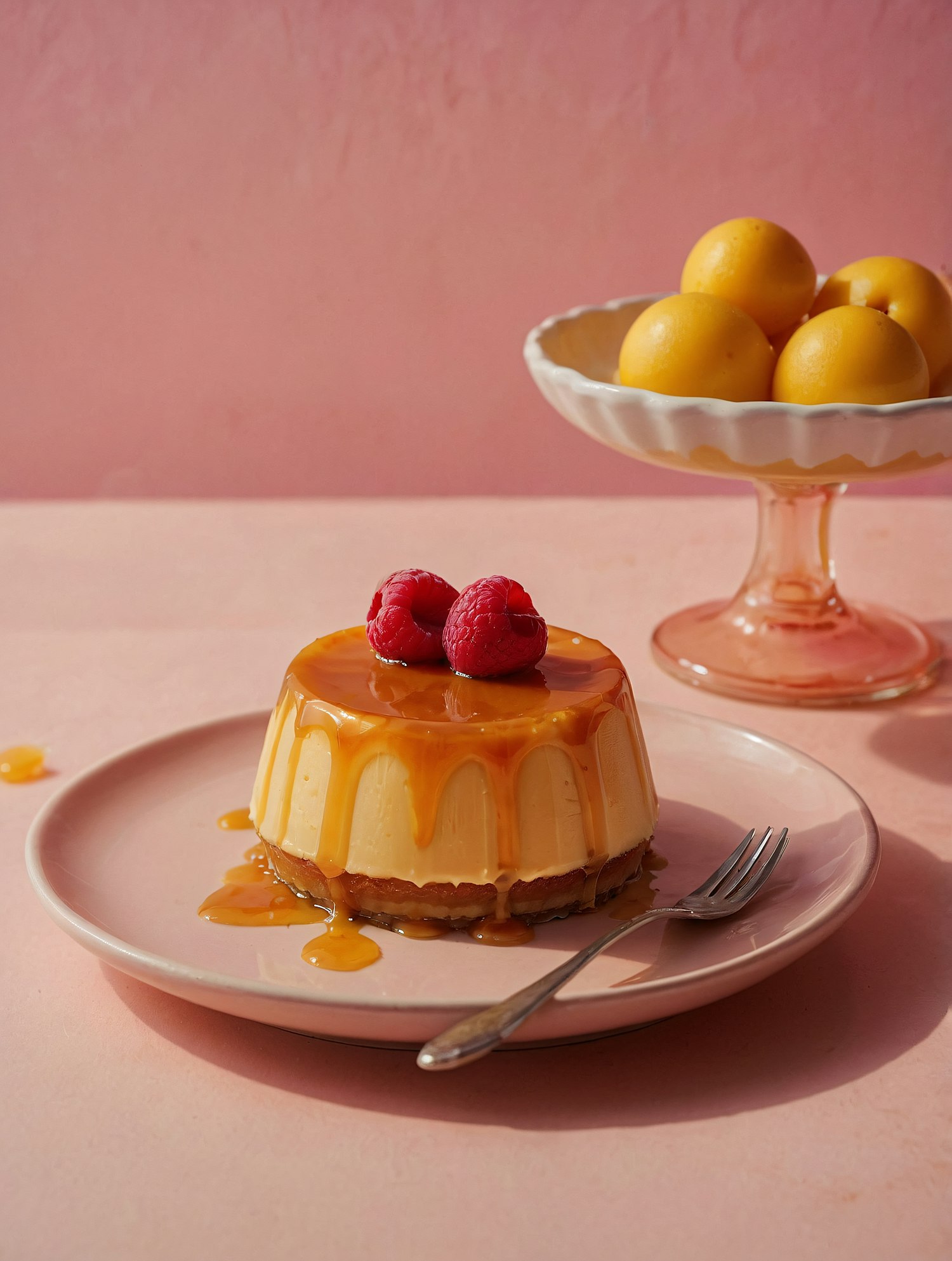 A creamy caramel dessert topped with raspberries on a pink plate, paired with a bowl of yellow plums in a soft pink setting.