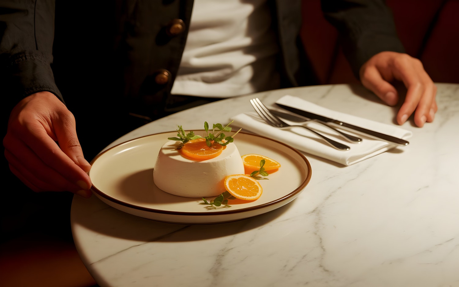 Elegant panna cotta dessert with orange slices and herbs on a marble table, paired with cutlery and warm lighting for a cozy dining vibe.