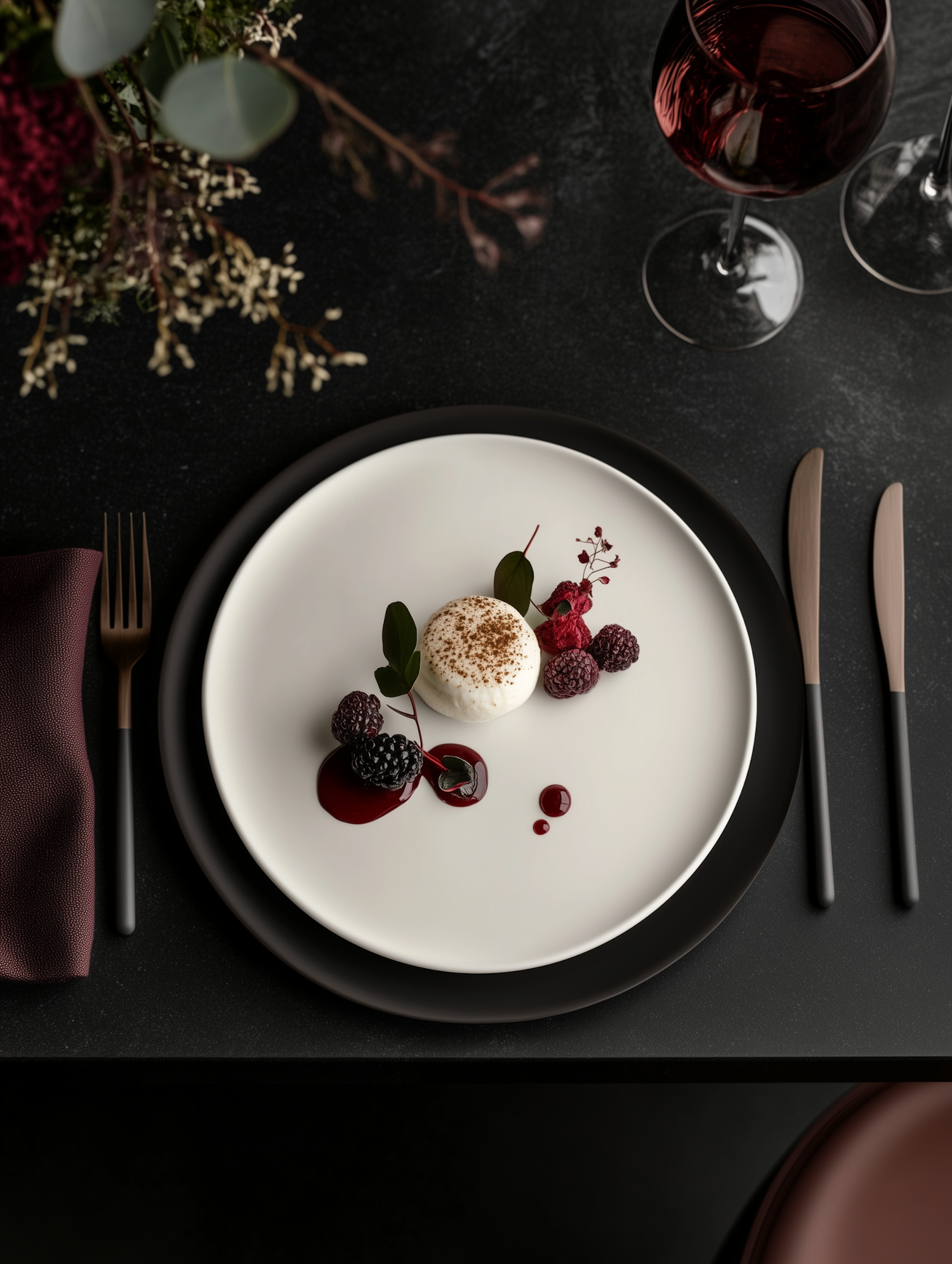 Elegant dessert plate with berries, cocoa-dusted treat, and wine on a dark table. Perfect for fine dining or gourmet inspiration.