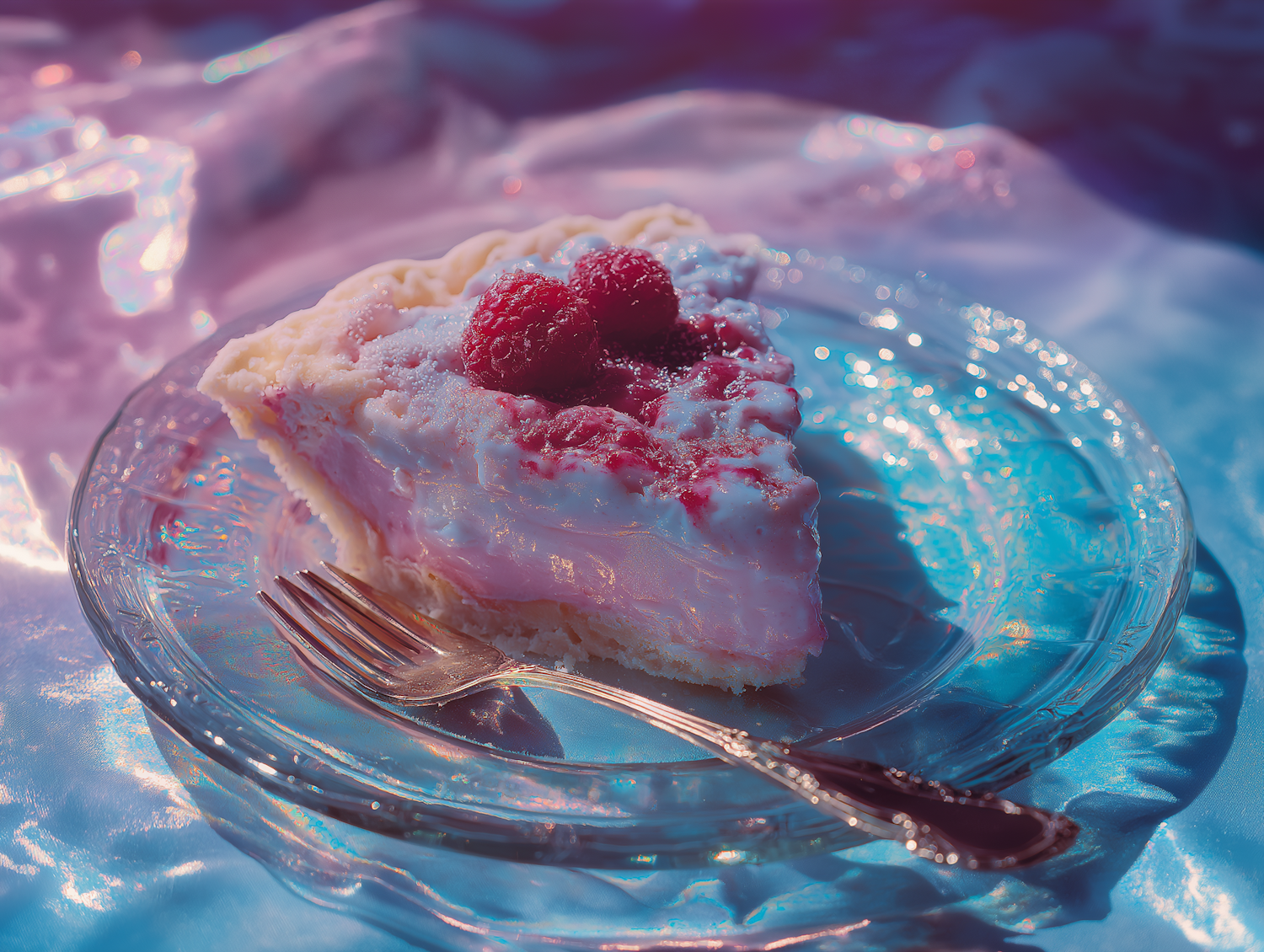 A dreamy slice of raspberry tart on a glass plate, with a silver fork and vibrant colors reflecting on a glossy surface.