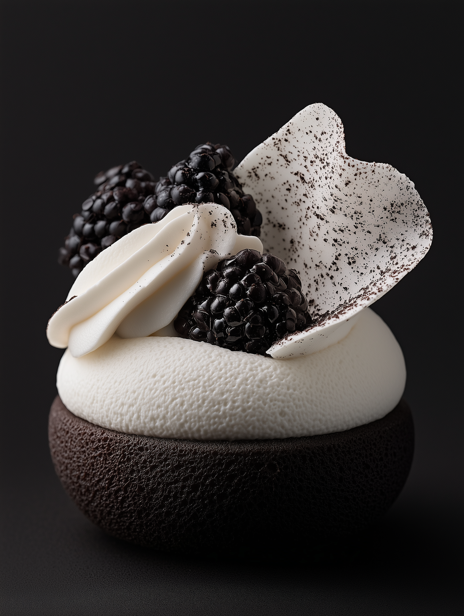 Luxurious dessert with dark chocolate base, creamy mousse, fresh blackberries, and speckled white chocolate shard.