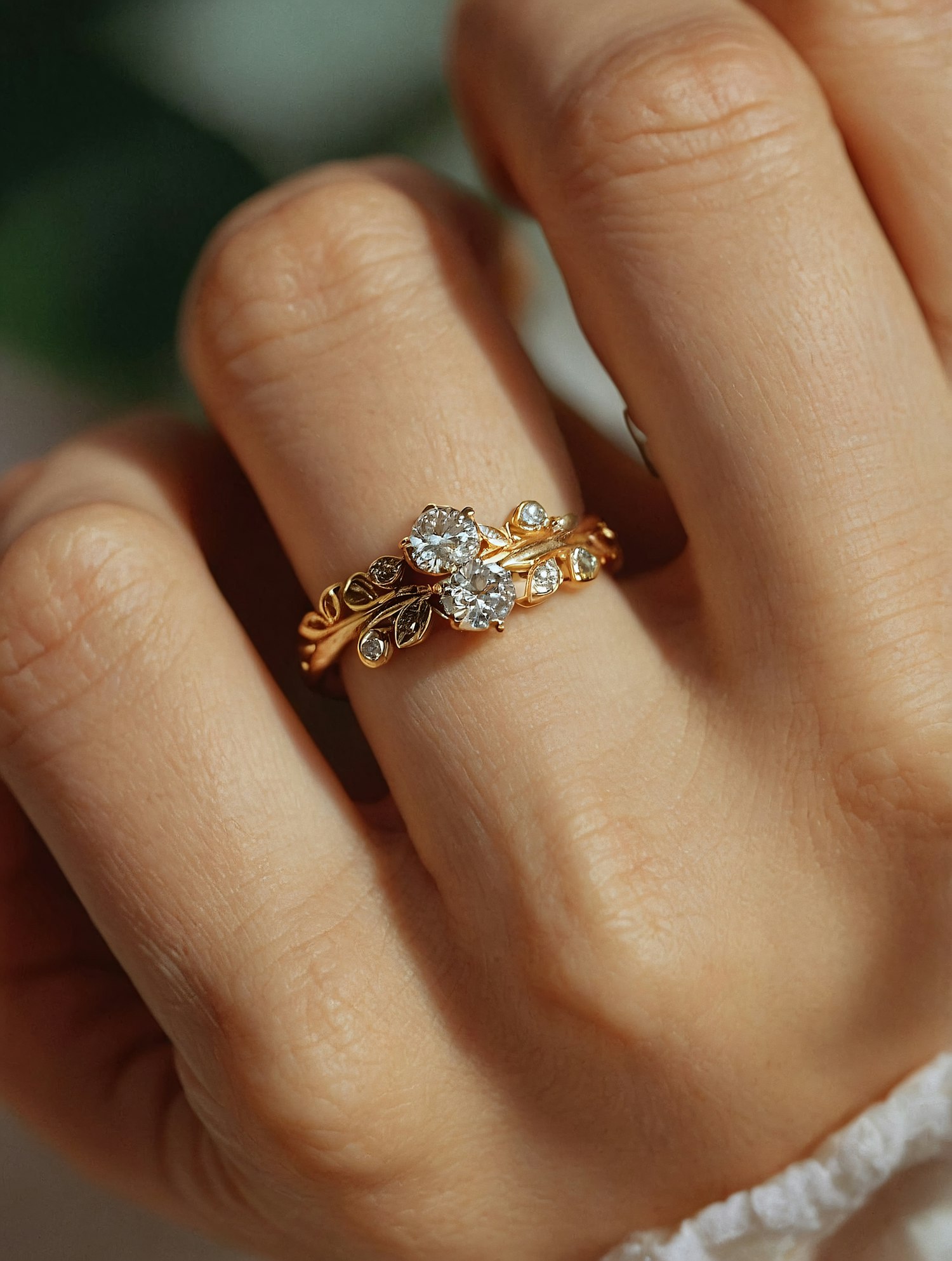 Elegant gold ring with diamond centerpiece and leaf design on a hand with light skin tone, showcasing intricate details.