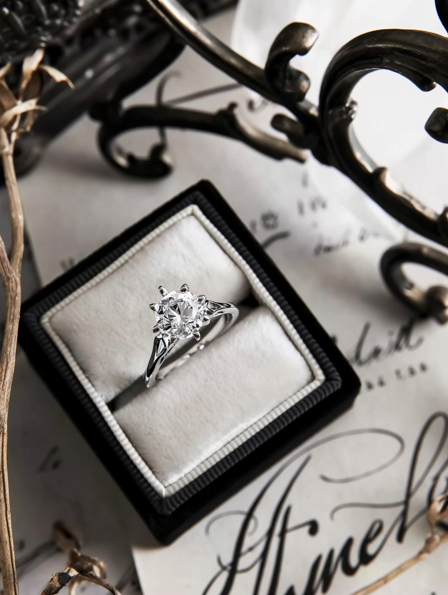 Elegant diamond ring in a black and white box with vintage decor, showcasing luxury and sophistication.