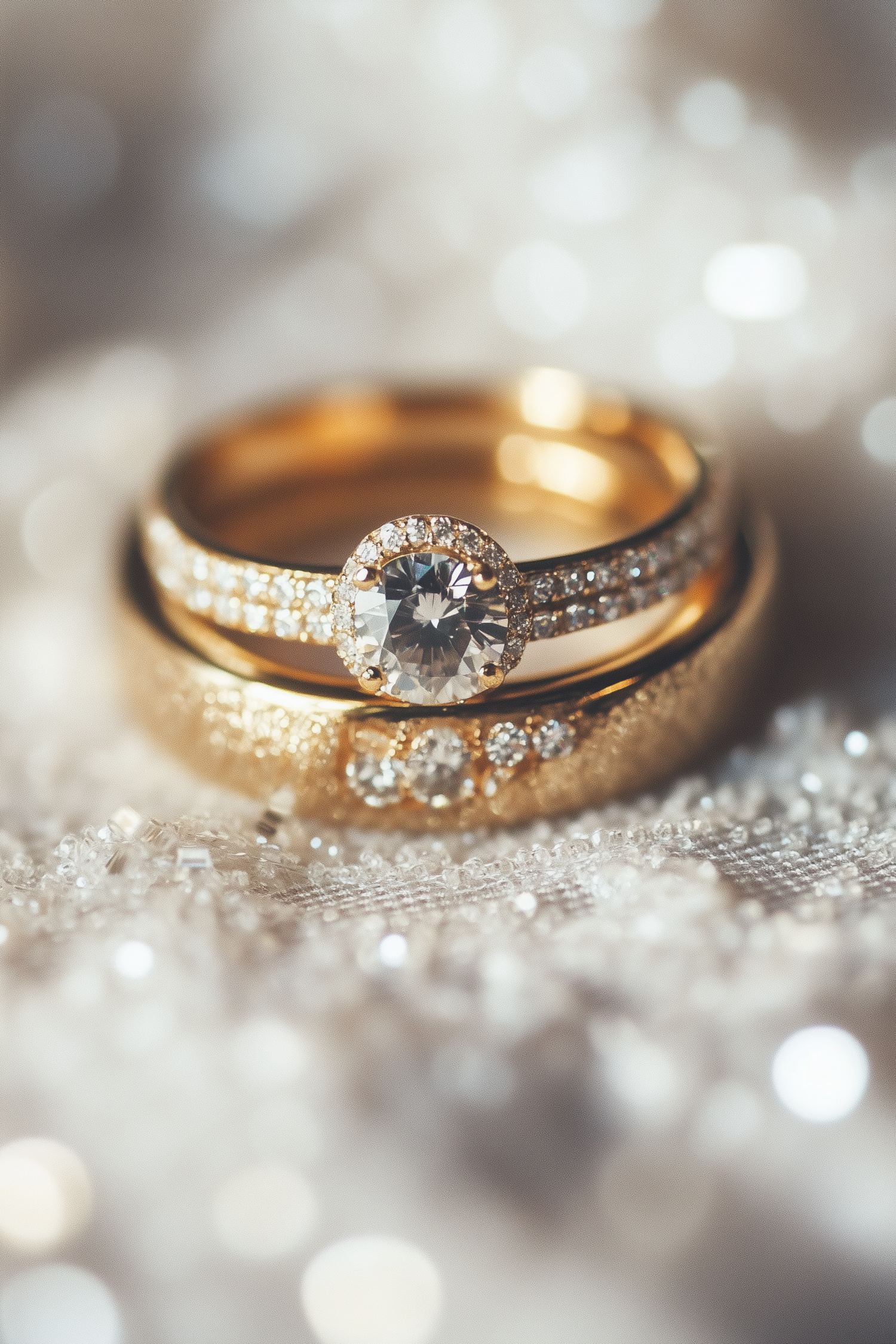 Close-up of two gold rings with diamonds on a sparkling surface, featuring a halo design and textured band.