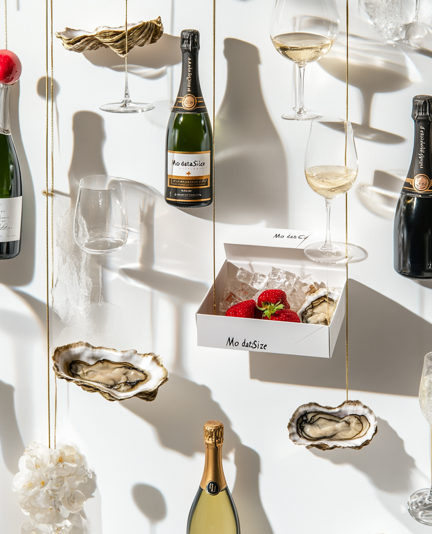 Elegant display of champagne bottles, wine glasses, strawberries, and oyster shells against a white background, creating a luxurious ambiance.
