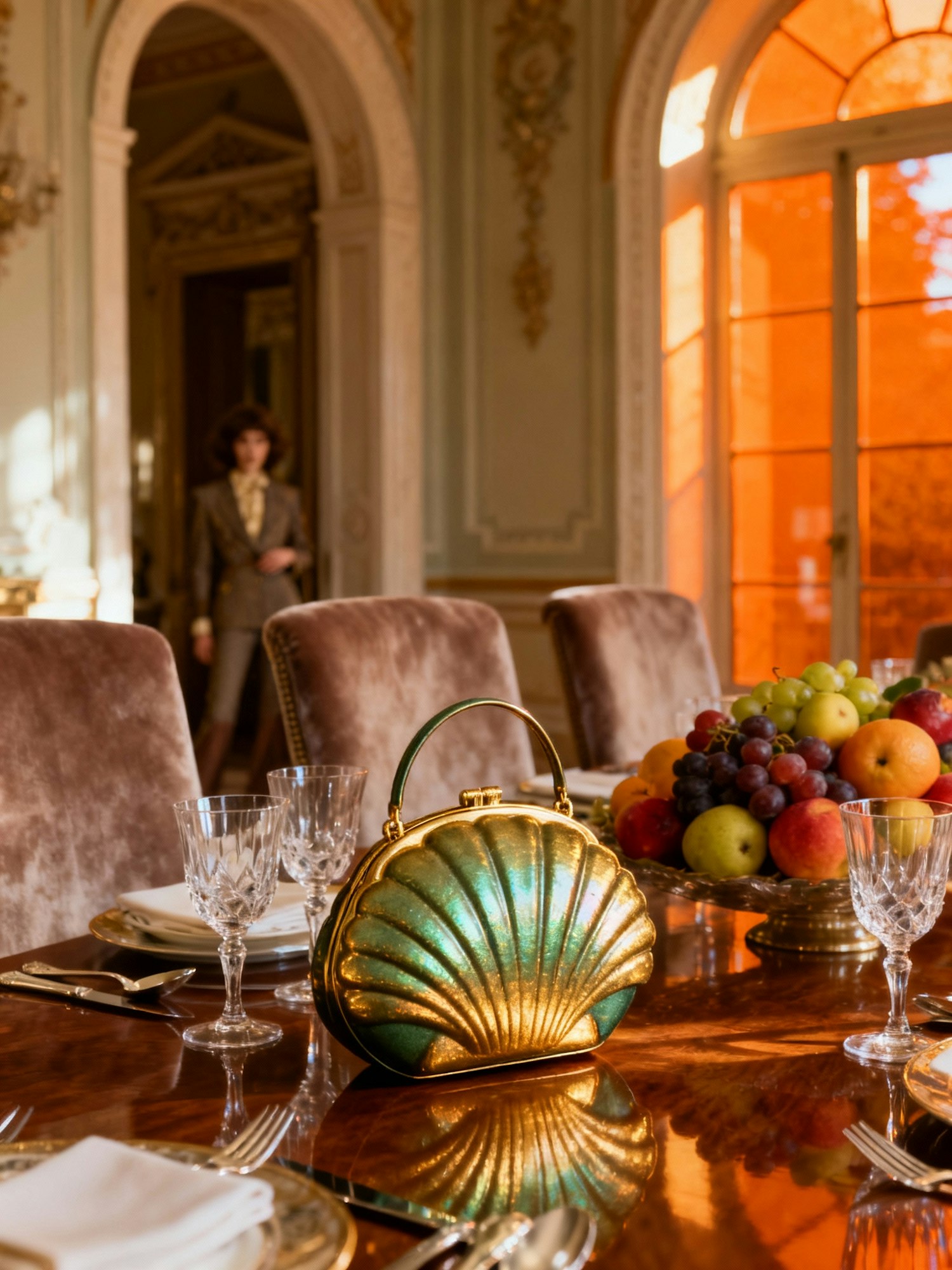 Editorial photoshoot inspired by 1970s luxury fashion, featuring bold color contrasts, rich textures, and sophisticated festive atmosphere. The scene should feel glamorous yet artistic, with refined lighting, tactile materials, and elegant composition. High-end styling, strong visual identity, cinematic depth of field, professional studio or architectural background, captured with a fashion-photography lens. A dining room scene: a handbag shaped like a sculpted shell sits among crystal glasses and fruit on a mahogany table. The bag’s surface is iridescent, mixing olive green and gold reflections. Sunlight streams through orange-tinted glass, creating warm highlights. The composition evokes a film still — elegant, decadent, dreamlike.