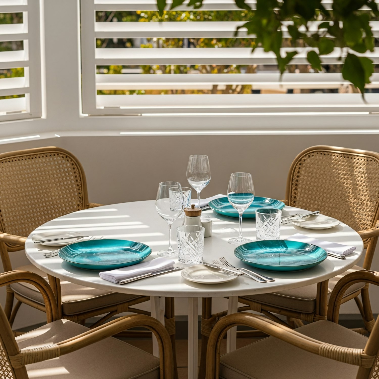 Elegant table setting with turquoise plates, crystal glasses, and wicker chairs, perfect for a sunny, relaxed dining experience.