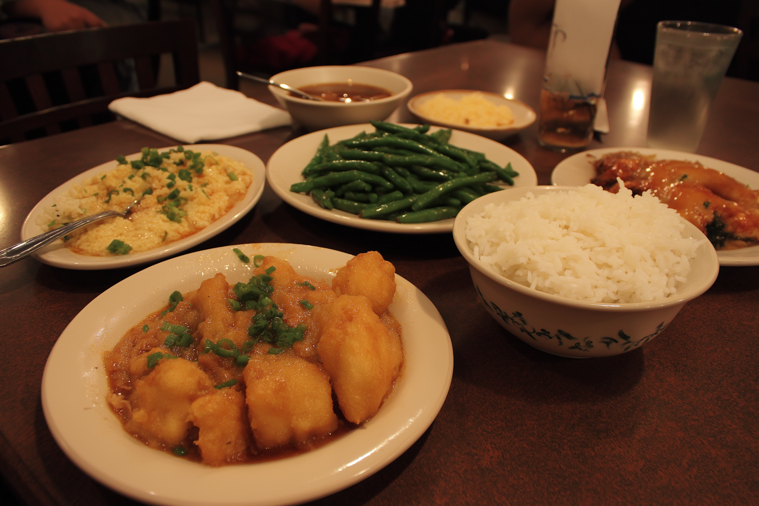 Chinese cuisine images: A cozy dinner setting featuring bowls of steamed rice, saucy fried food, sweet meat, green beans, and cheesy grits, all on a wooden table.