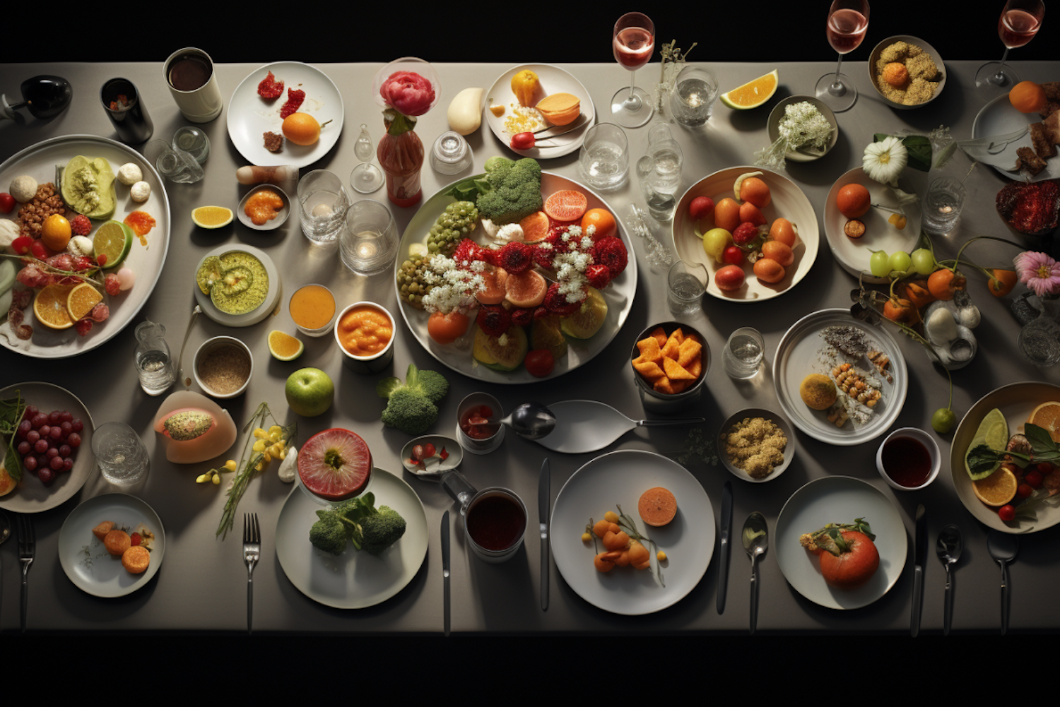 A vibrant table setting with colorful fruits, vegetables, and elegant glassware, creating a visually appealing dining experience.