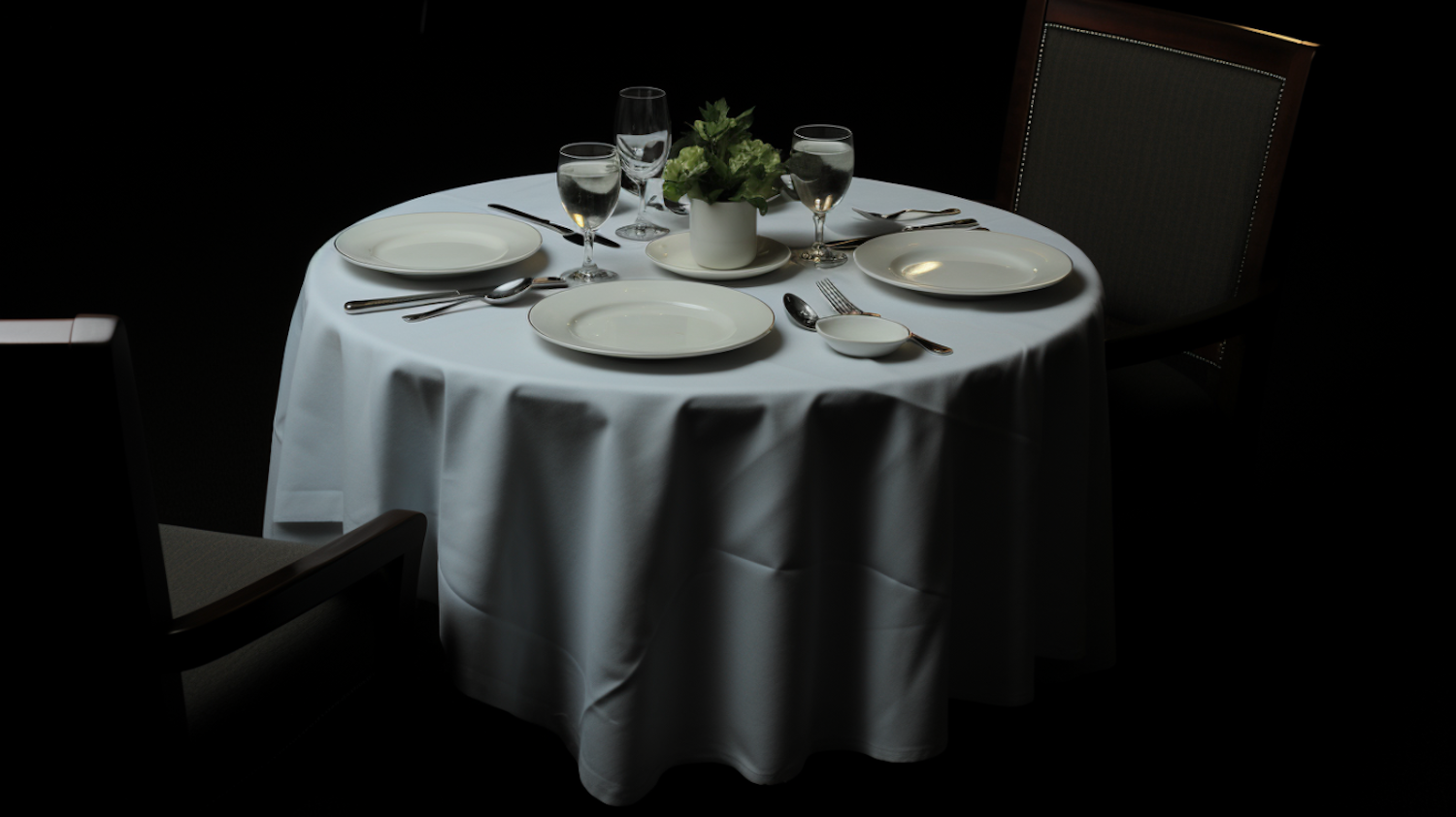 Elegant dining table set for two with white plates, glasses, and a floral centerpiece on a white tablecloth.