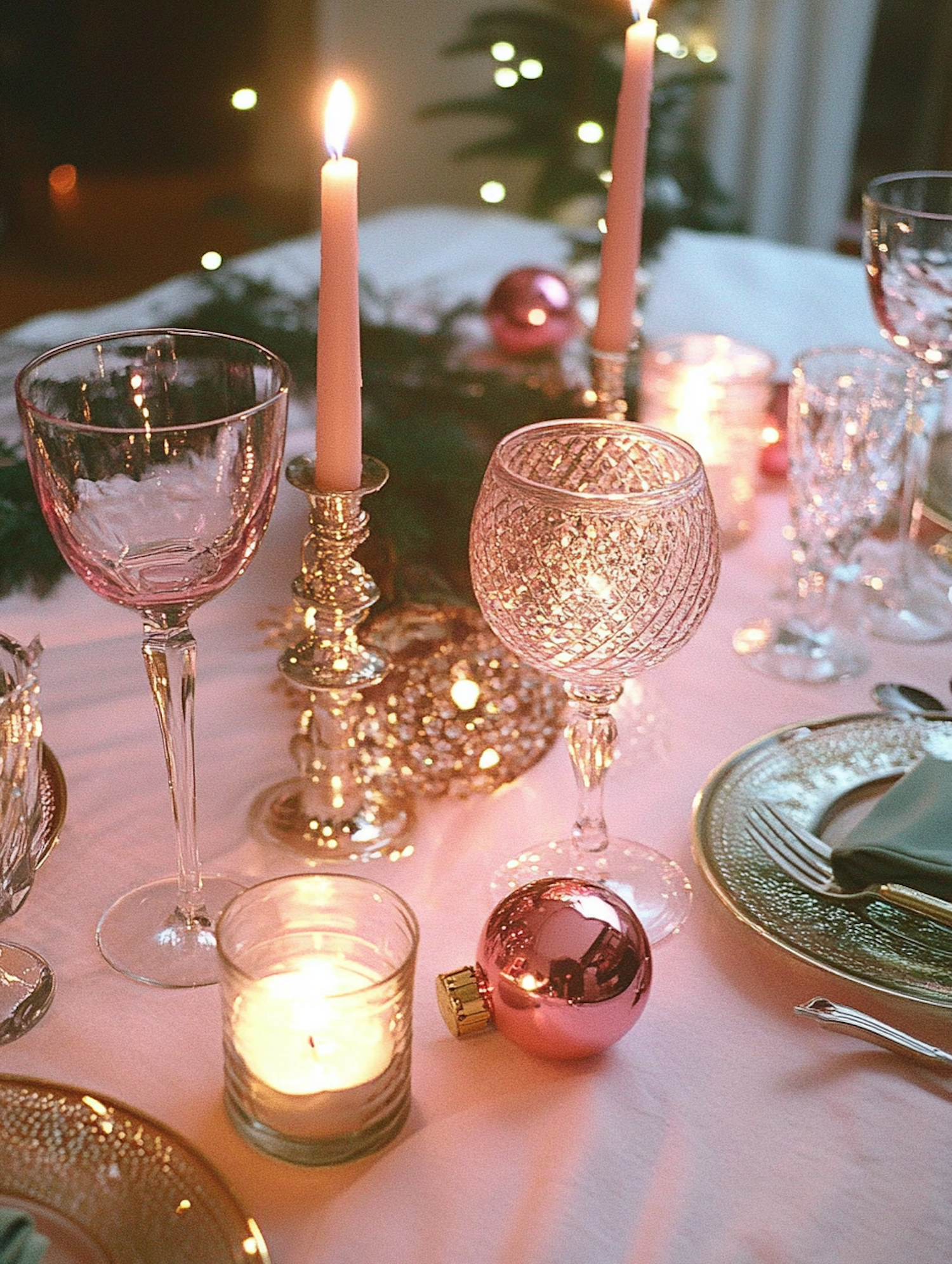 Elegant dining table with crystal glassware, candles, and festive decor. Soft pink and gold accents create a warm, luxurious ambiance.