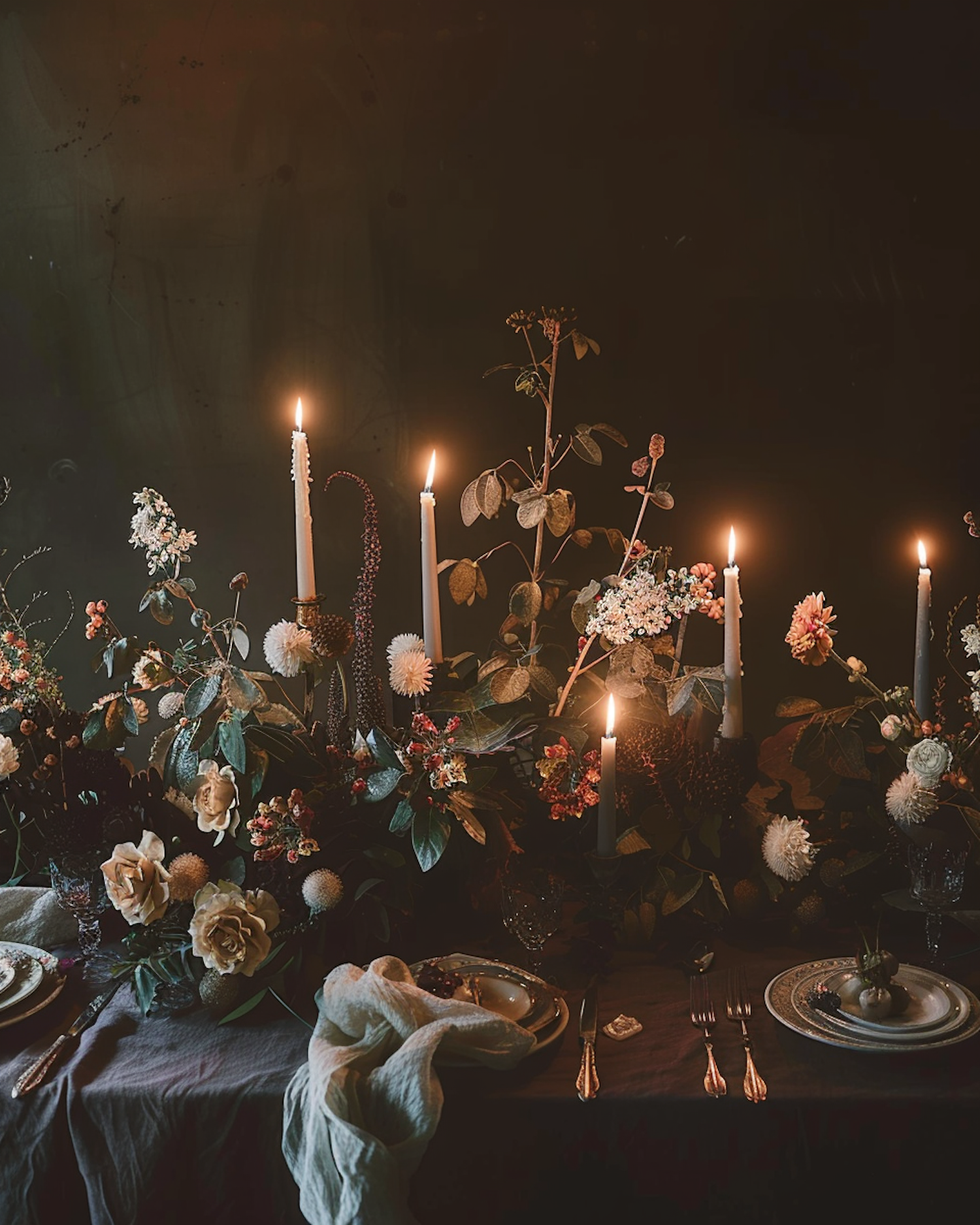 Elegant dining table with lush flowers, candles, and fine china, creating a warm, intimate atmosphere for a special occasion.