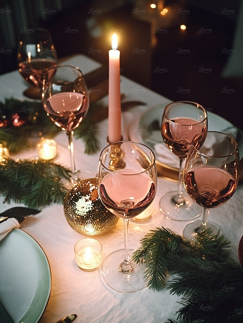 Elegant dining table with rosé wine glasses, pink candle, evergreen sprigs, and a gold ornament, creating a warm, festive ambiance.