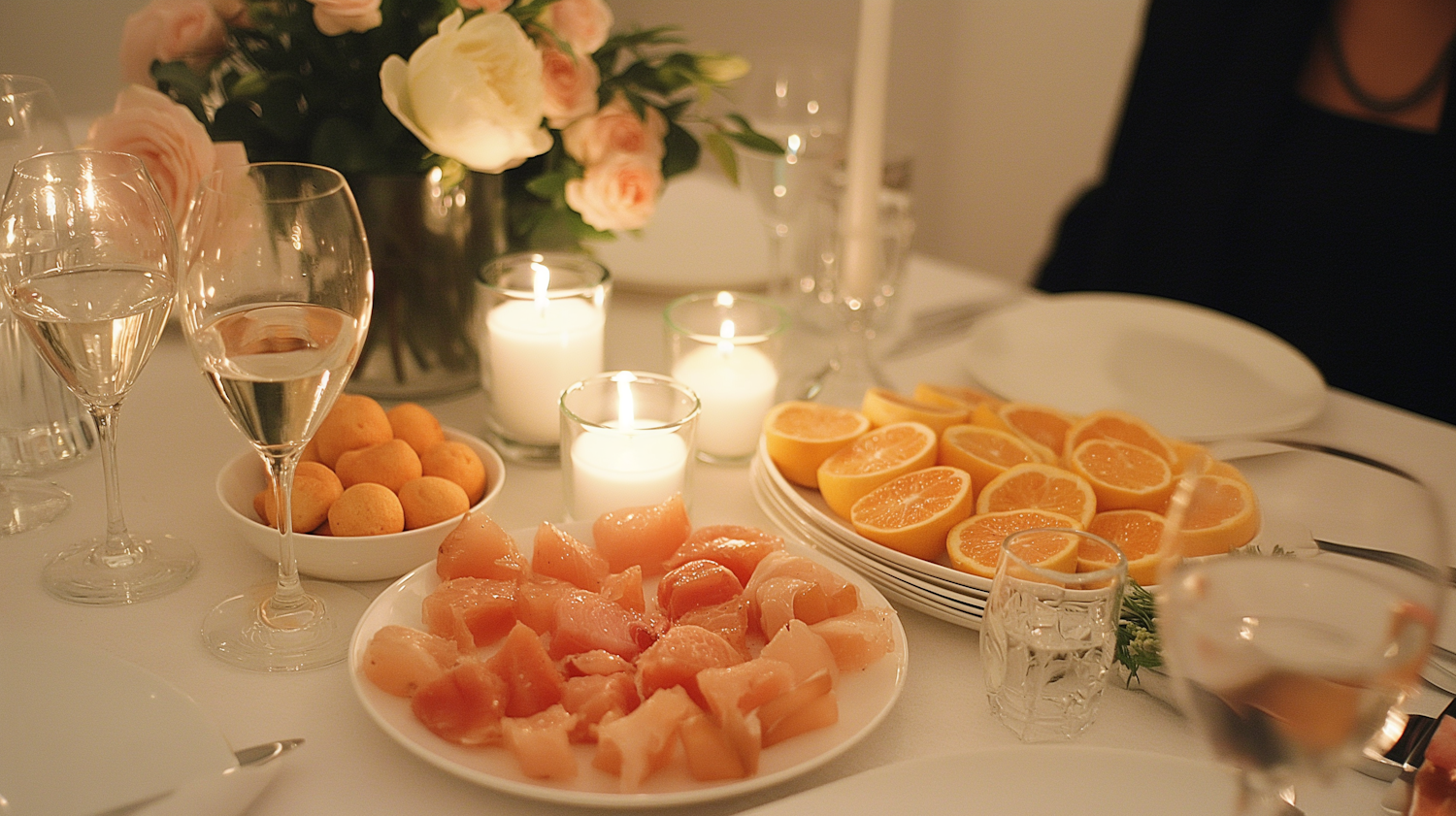 Elegant dining table with candles, wine glasses, fresh orange slices, pastries, and a floral centerpiece for a romantic dinner setting.