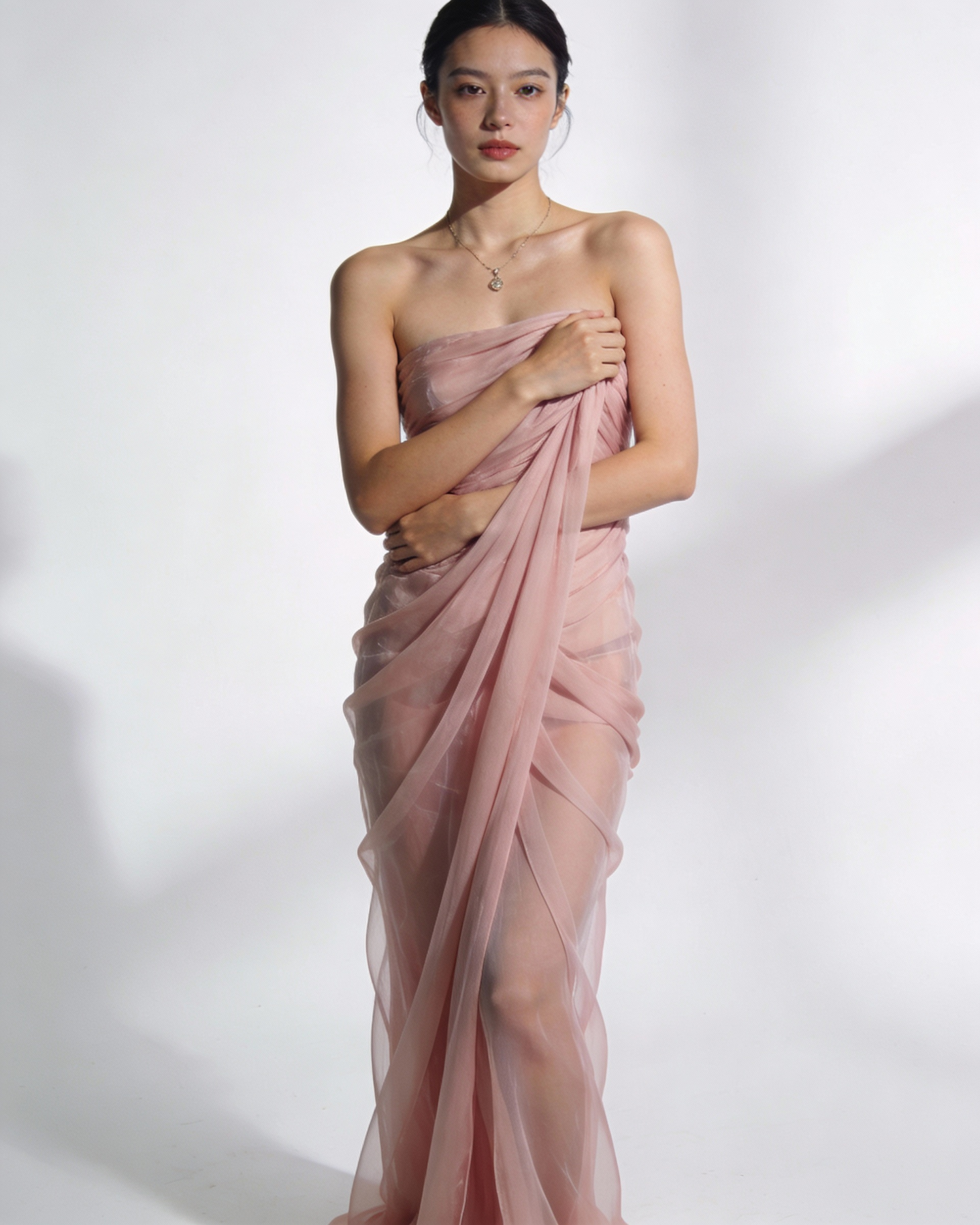 High-end studio fashion editorial portrait of a female model wearing a long flowing draped pink chiffon gown, sculptural fabric wraps around the body creating soft translucent layers, luxurious minimalist aesthetic, pure white seamless studio background, soft diffused daylight studio lighting, subtle shadows, balanced highlights, elegant and calm mood, premium jewelry editorial style, natural refined makeup, smooth luminous skin, neutral expression, sophisticated presence, fashion magazine quality, ultra realistic, high resolution, shallow depth of field, cinematic softness, 4:5 vertical composition Pose: model standing upright, body slightly angled, shoulders relaxed, arms gently holding part of the draped fabric close to the torso, simple and timeless posture Camera: medium portrait, framing from mid-thigh to top of head, straight-on angle, eye-level
