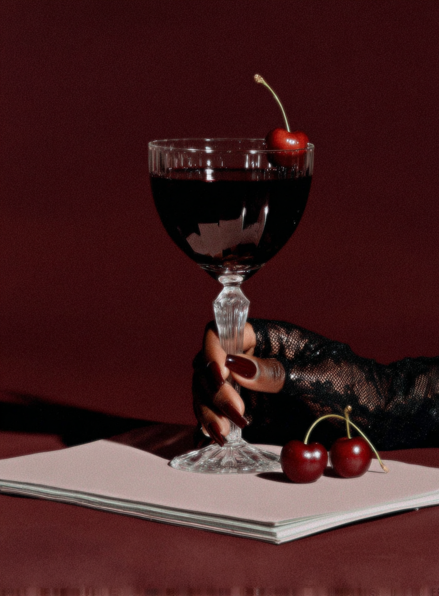 A crystal glass with a dark drink and cherry garnish, held by a gloved hand, set against a deep red background with cherries nearby.