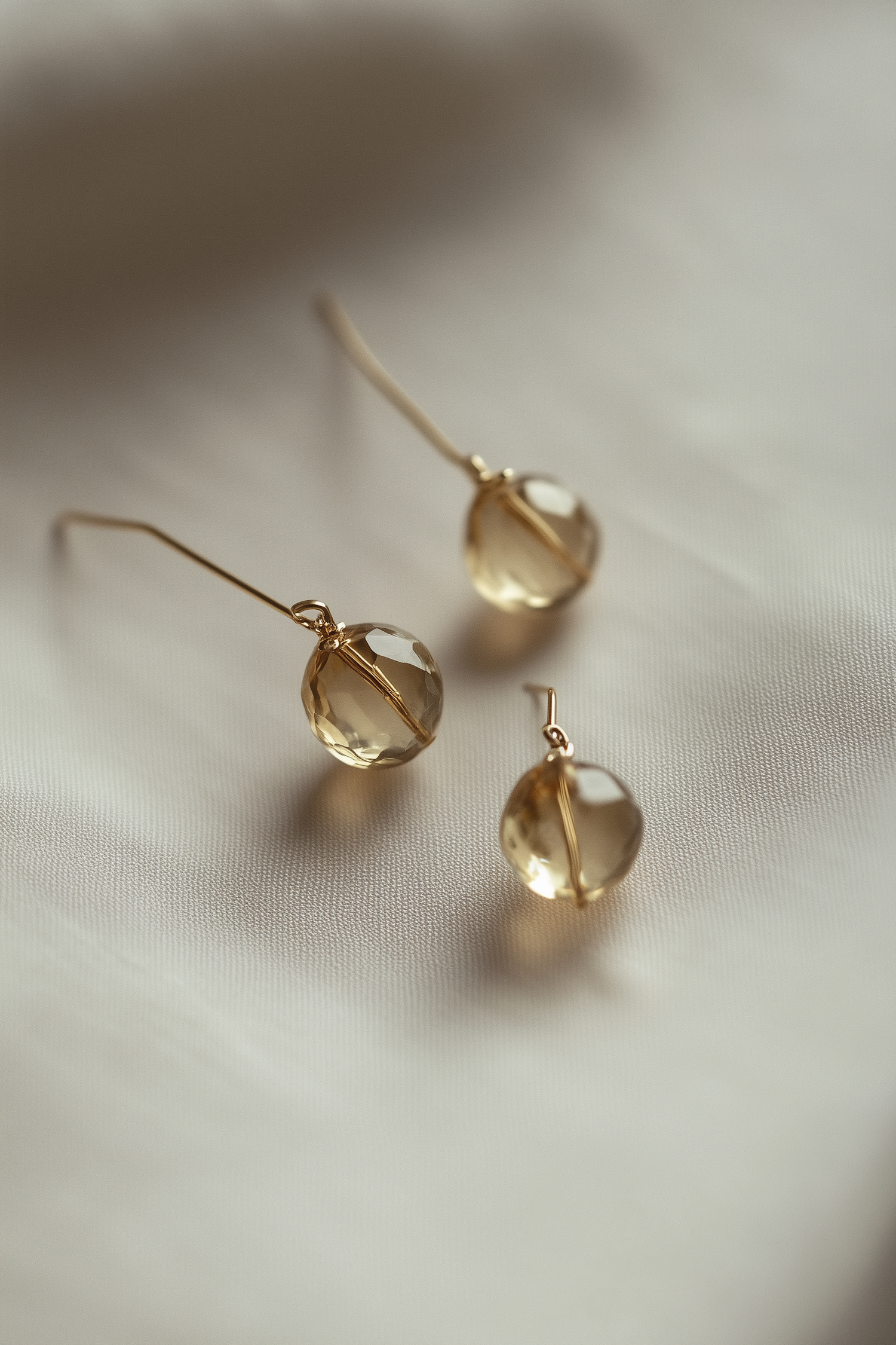 Elegant gold drop earrings with translucent faceted beads on a soft fabric background, perfect for a minimalist and sophisticated look.