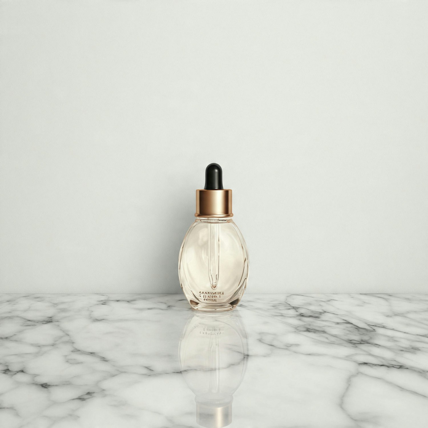 Elegant dropper bottle with golden cap on a marble surface, perfect for showcasing skincare or beauty products.