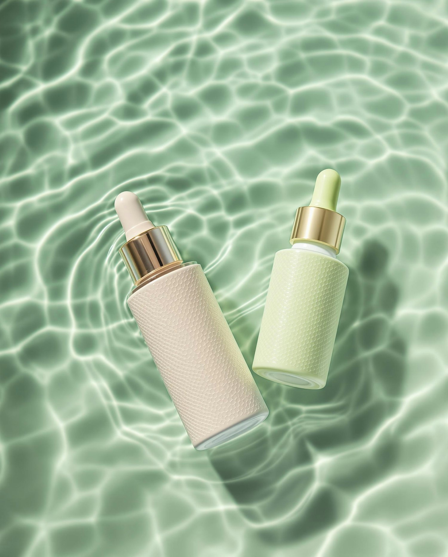 Two textured dropper bottles, beige and green, with gold accents, floating on rippling green water, evoking freshness and luxury.