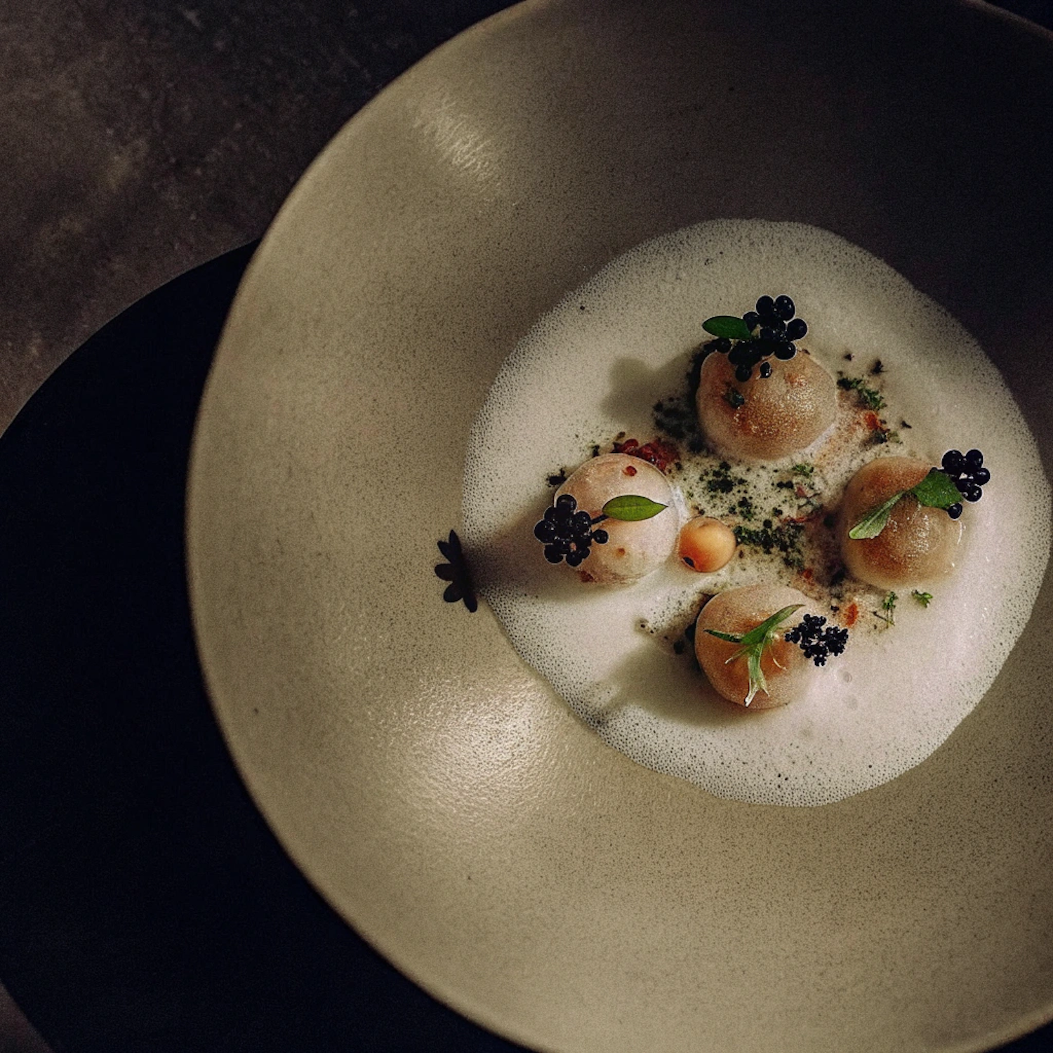 Elegant dish with dumplings, foam, black edible flowers, and microgreens in a shallow beige bowl, perfect for fine dining enthusiasts.