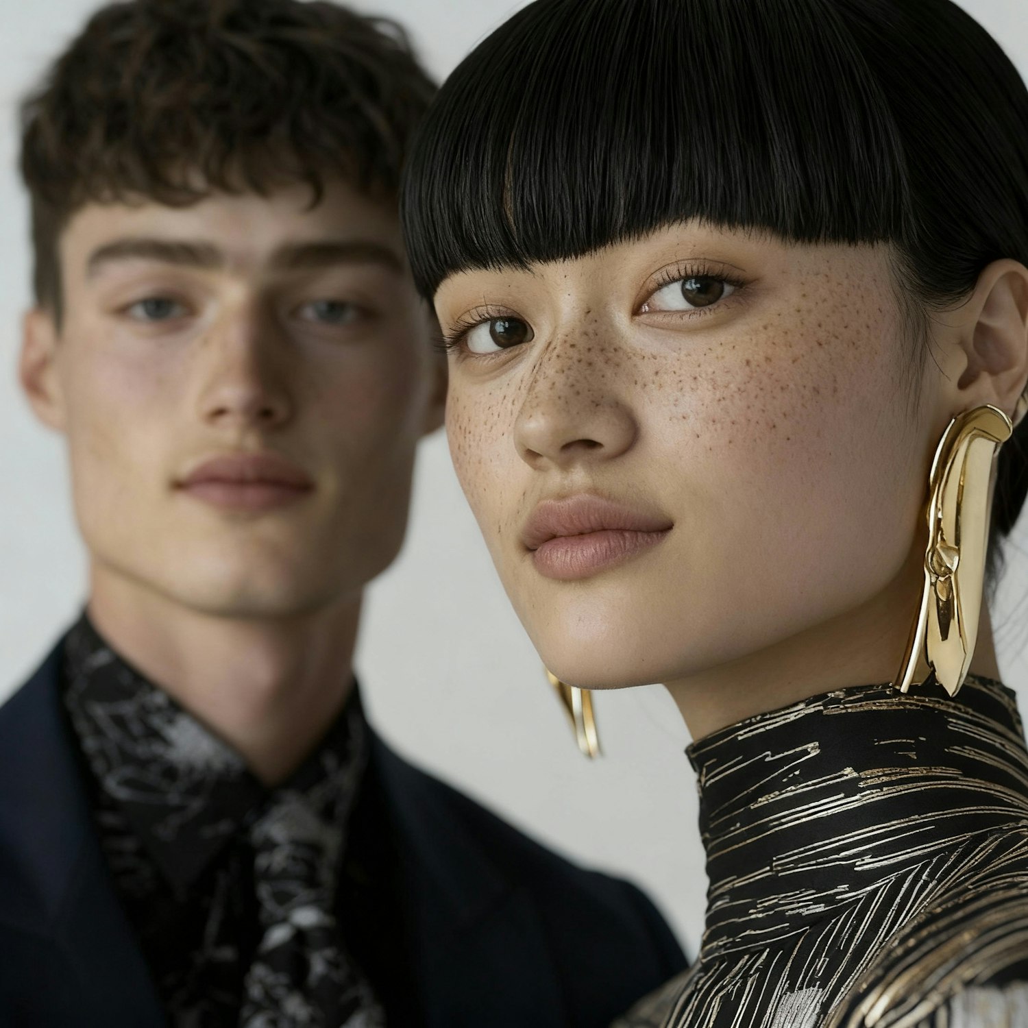 Close-up of a stylish woman with freckles and gold earrings, accompanied by a man in a suit, both exuding modern elegance.