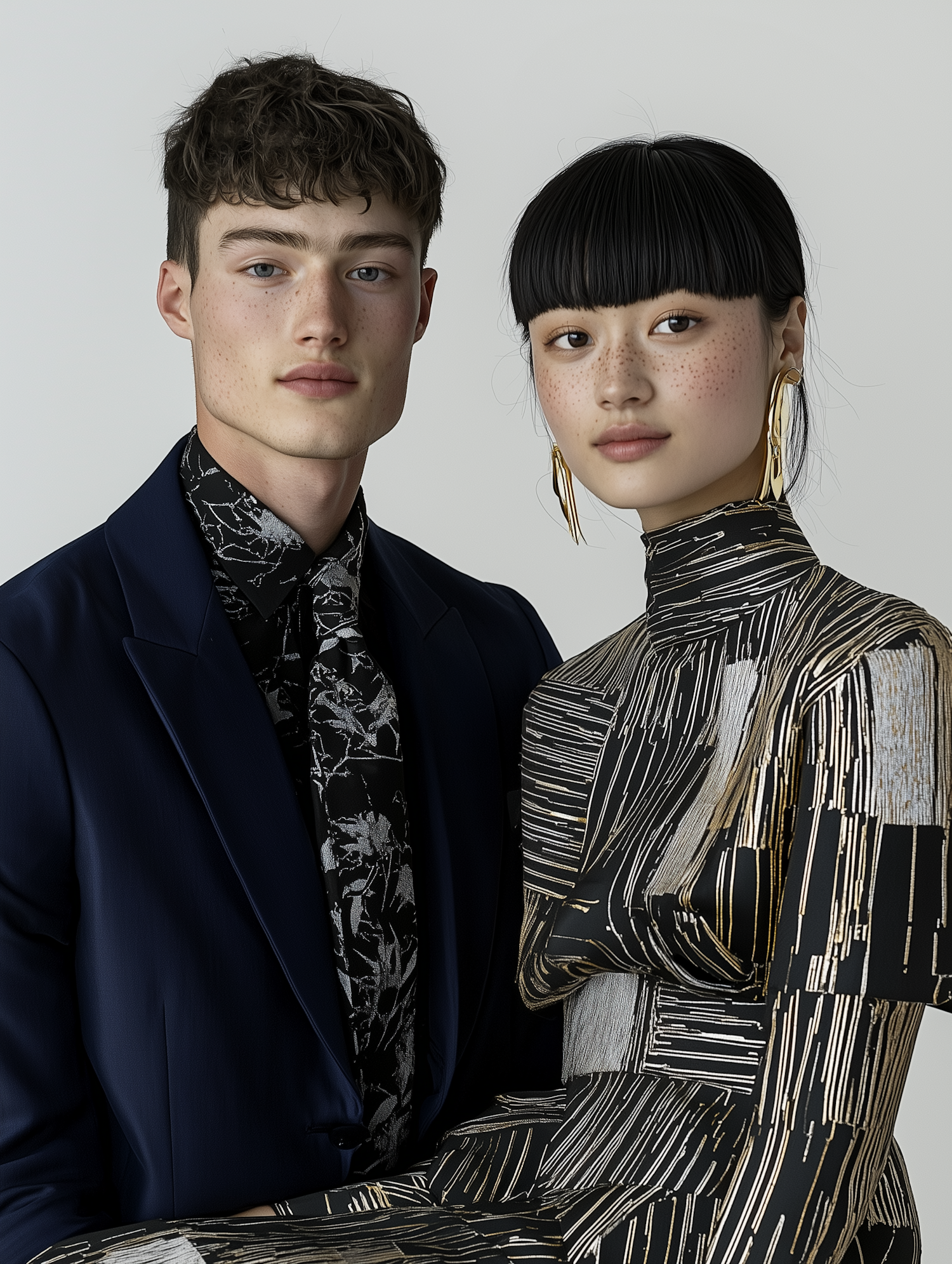 Stylish young couple in patterned outfits, featuring a dark blue suit and geometric dress, with striking gold earrings.