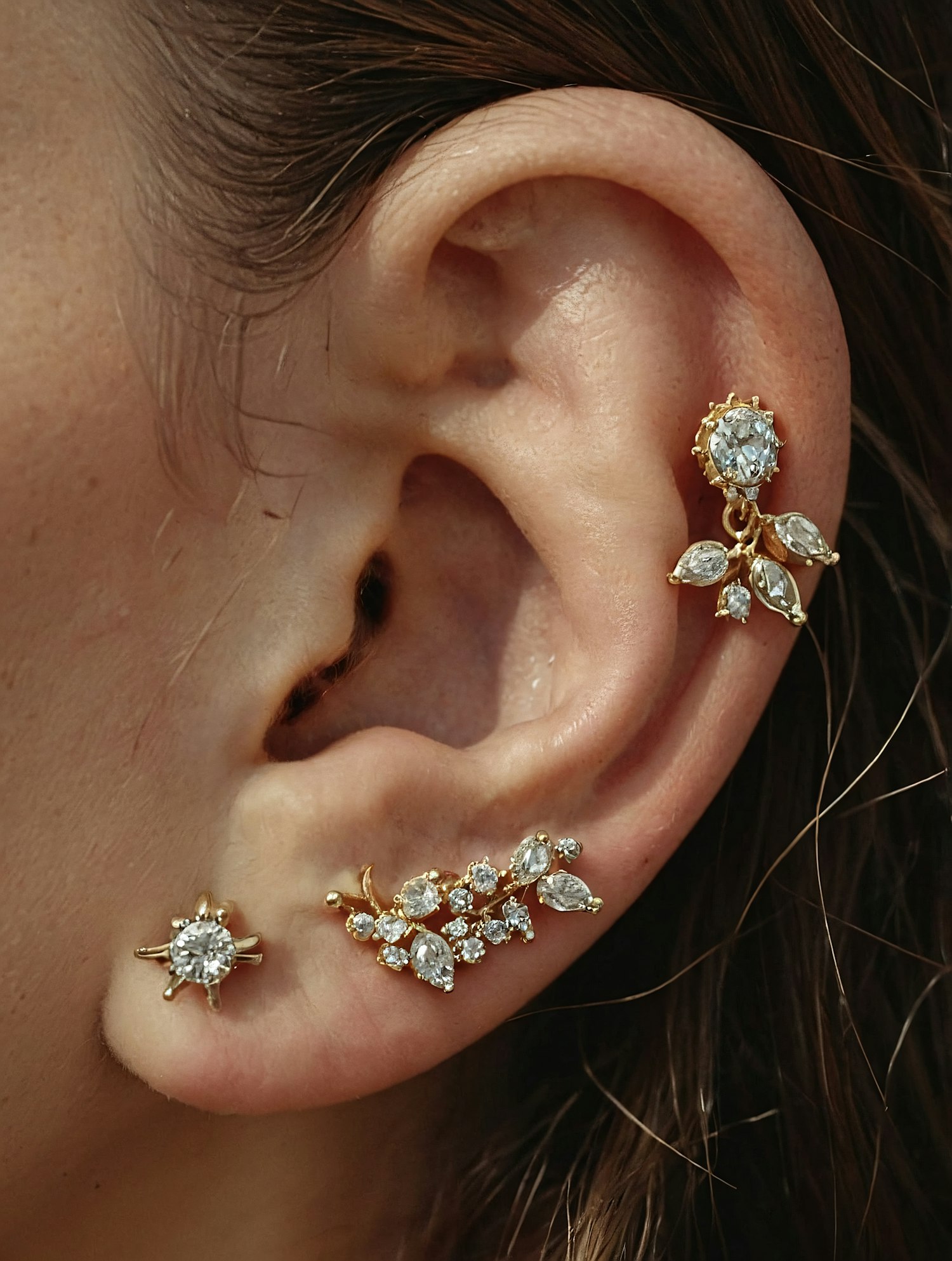 Close-up of an ear with three gold and diamond earrings, featuring floral and leaf designs, showcasing luxury and elegance.
